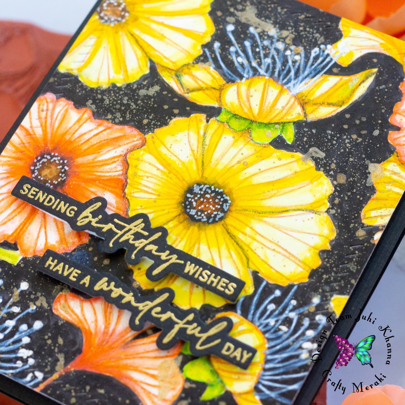 For my second card, I decided to add a black background. I first stamped the image with Ink On 3 fadeout ink on Strathmore Bristol Smooth Cardstock. I then colored in the flowers with watercolor markers and added details with colored pencils and a white posca pen. Following this, I colored in the background with a black marker and added gold splatters to finish the card.