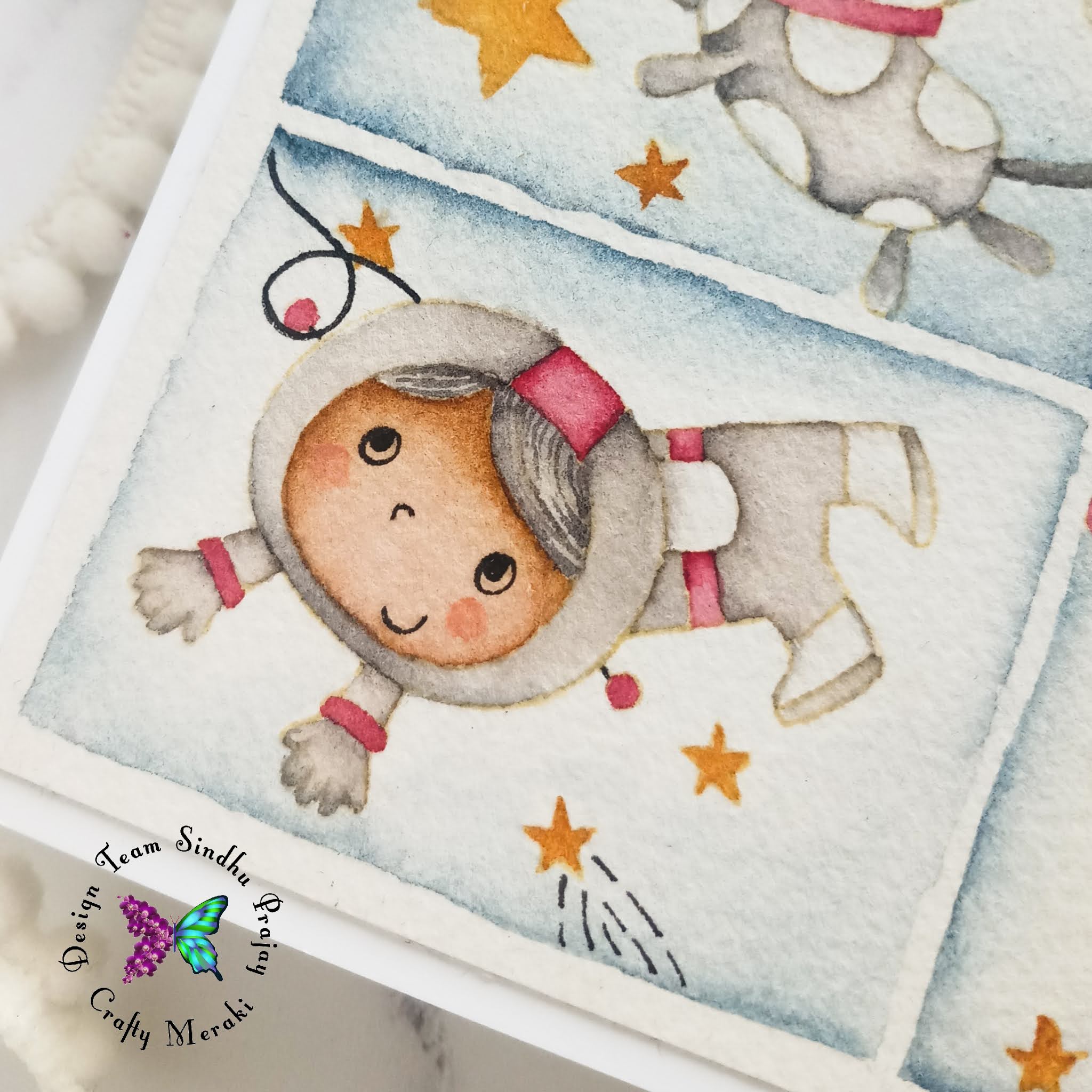 I masked the edges with a masking tape and stamped the images using Antique Linen Distress Ink. This time, I coloured images with Karin Markers...all except the cute astronaut's face.