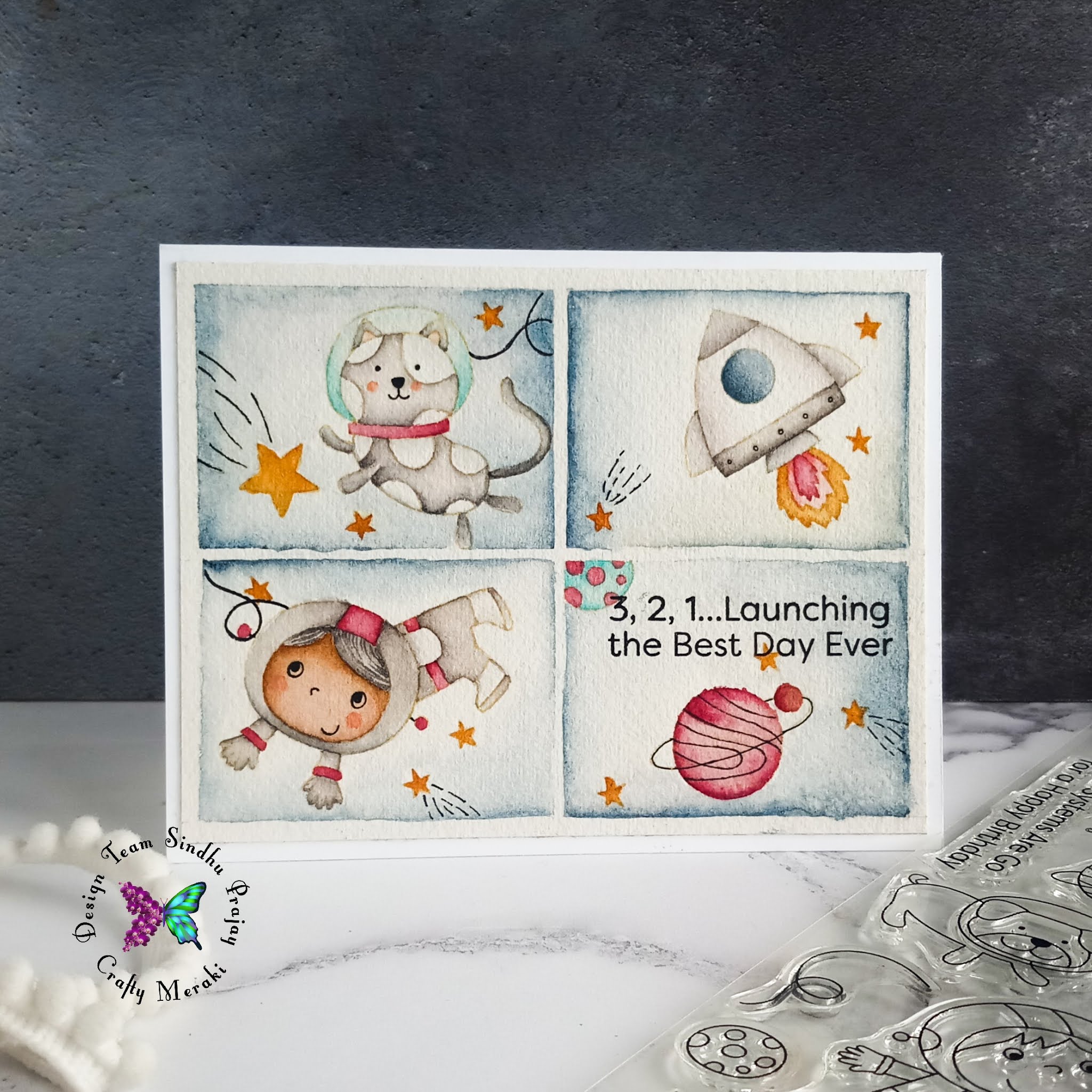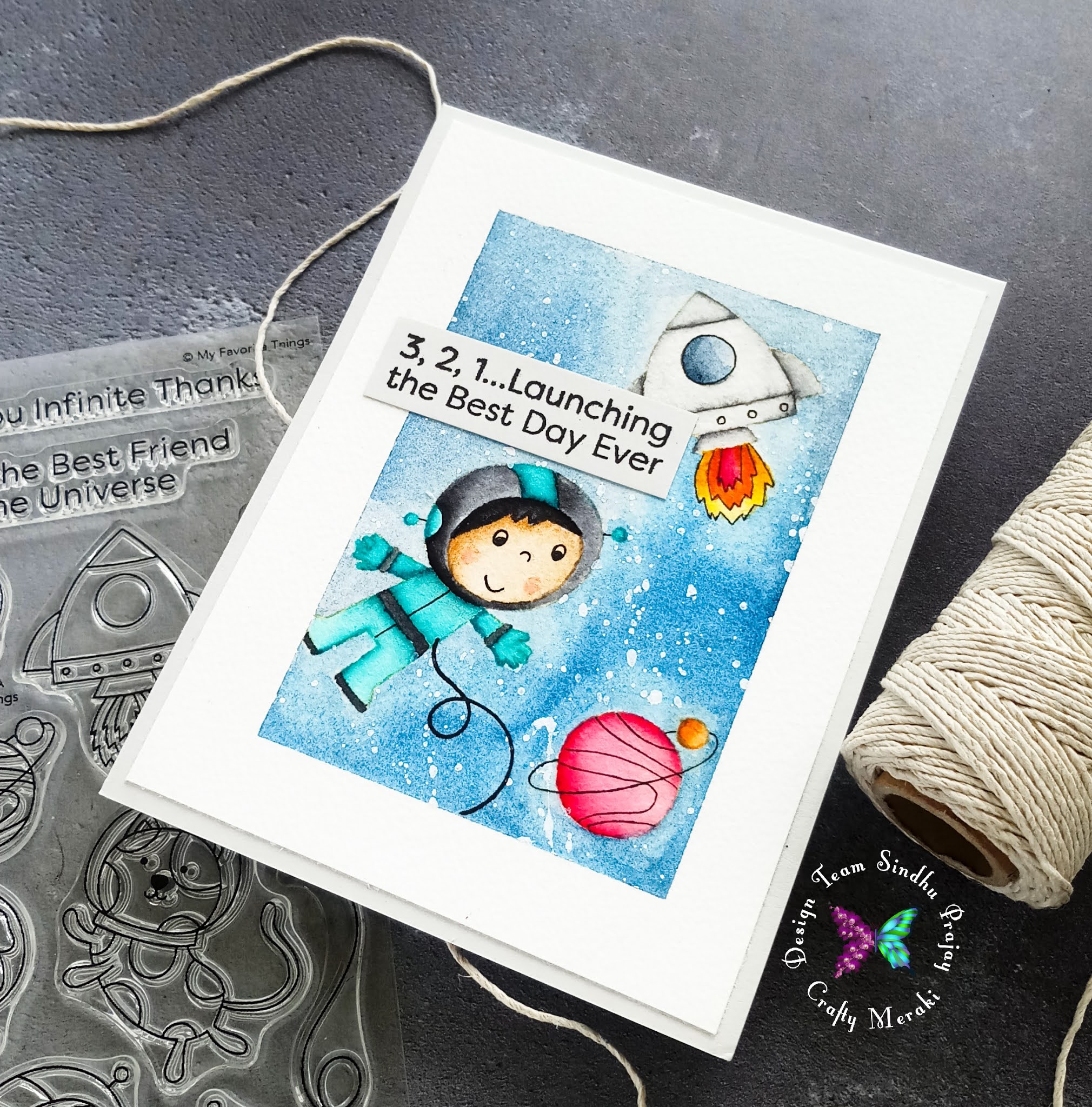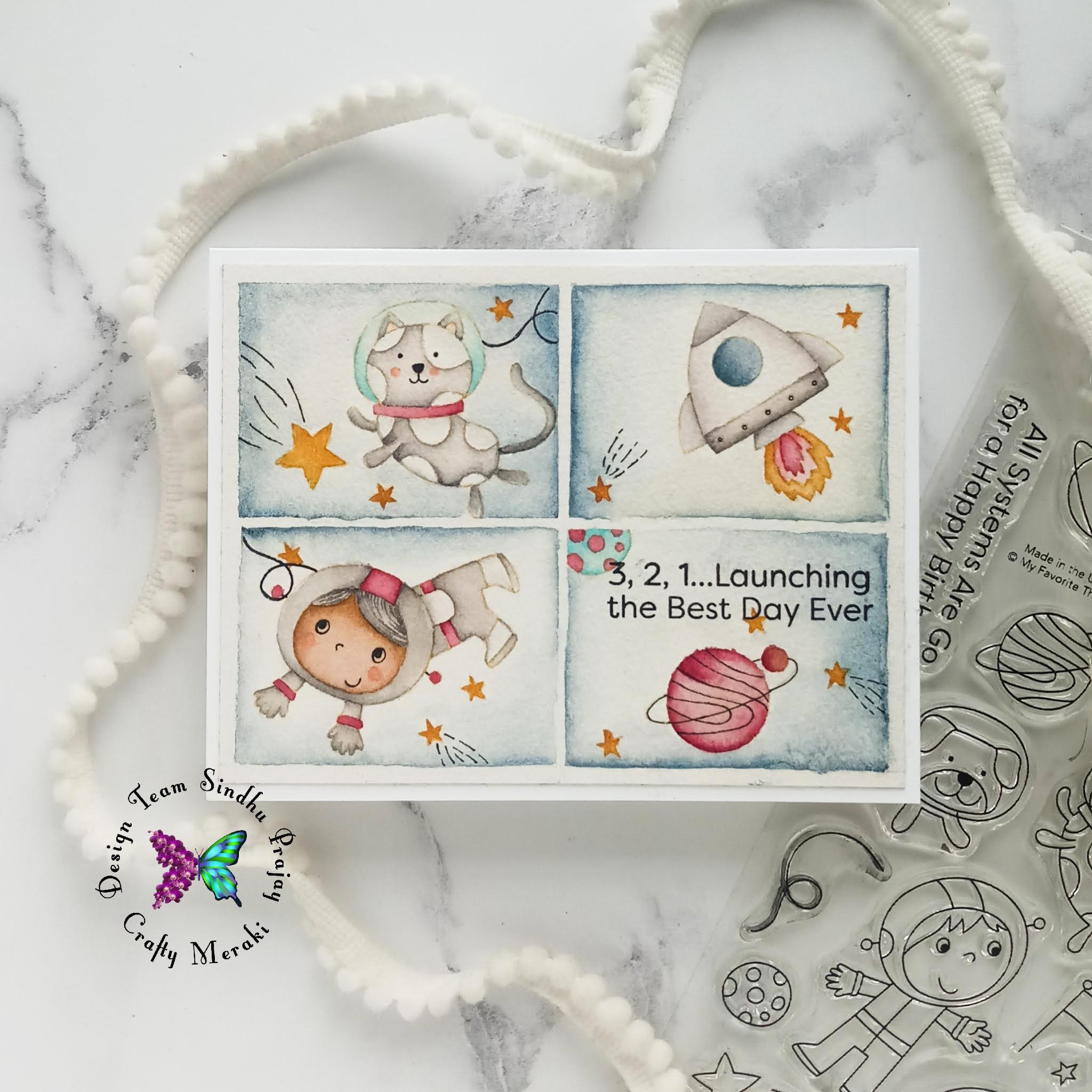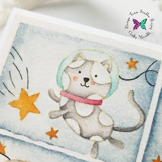 I used My Favorite Things 'Best friends in the universe' stamp set and watercoloured the images. I created a collage style card and a cute scene on another. I had done the collage style card in the past once and enjoyed making it. So I wanted to do it again.