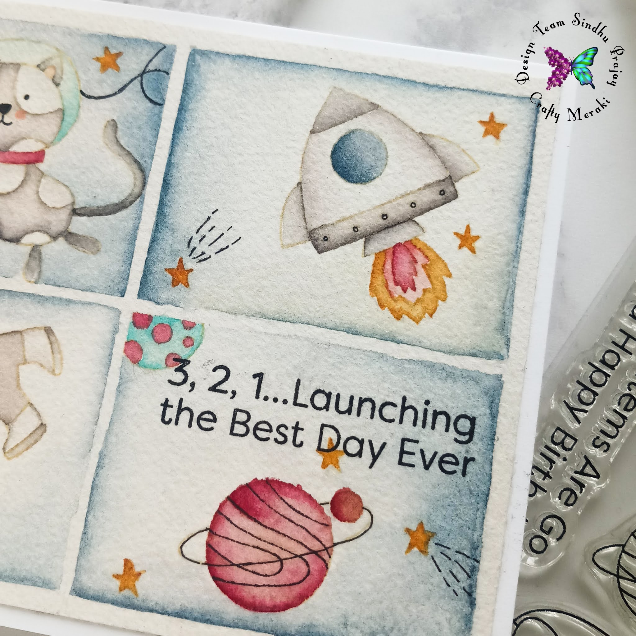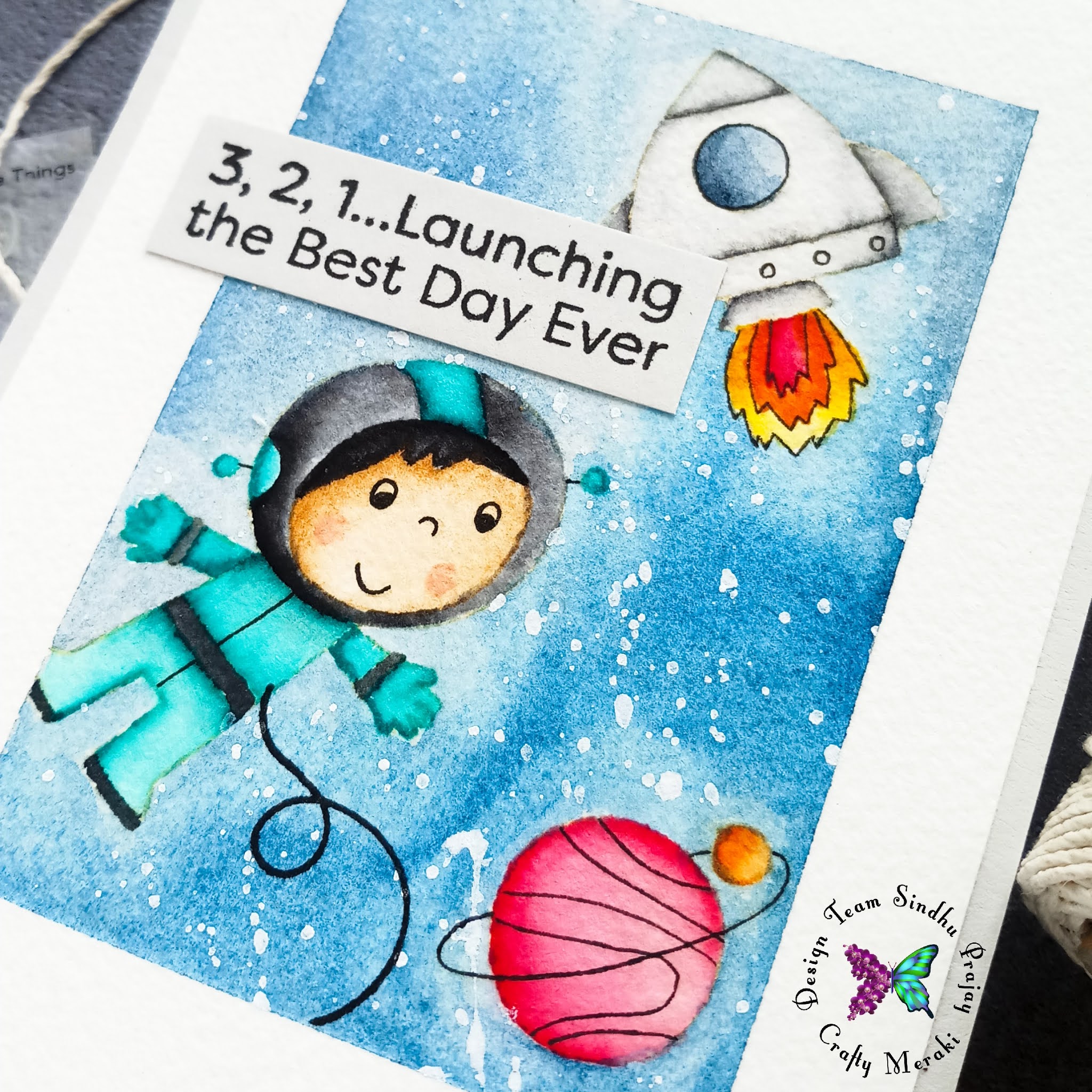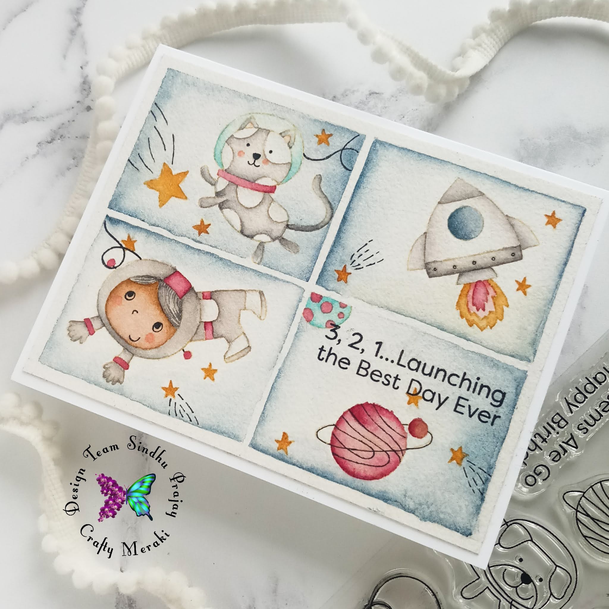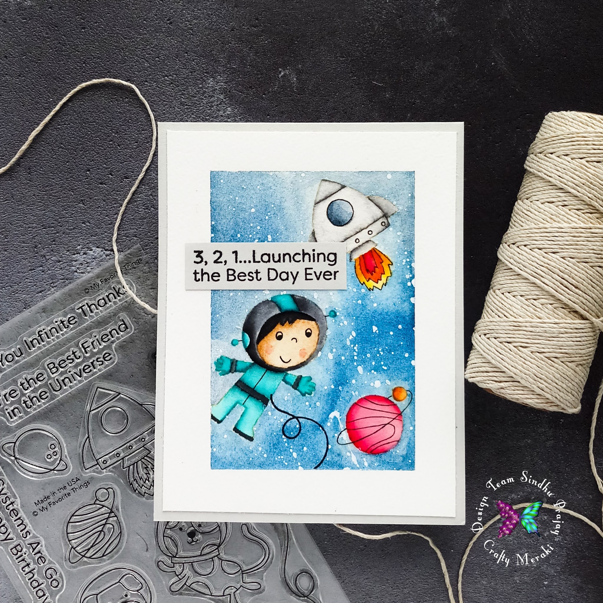 I used My Favorite Things 'Best friends in the universe' stamp set and watercoloured the images. I created a collage style card and a cute scene on another. I had done the collage style card in the past once and enjoyed making it. So I wanted to do it again.