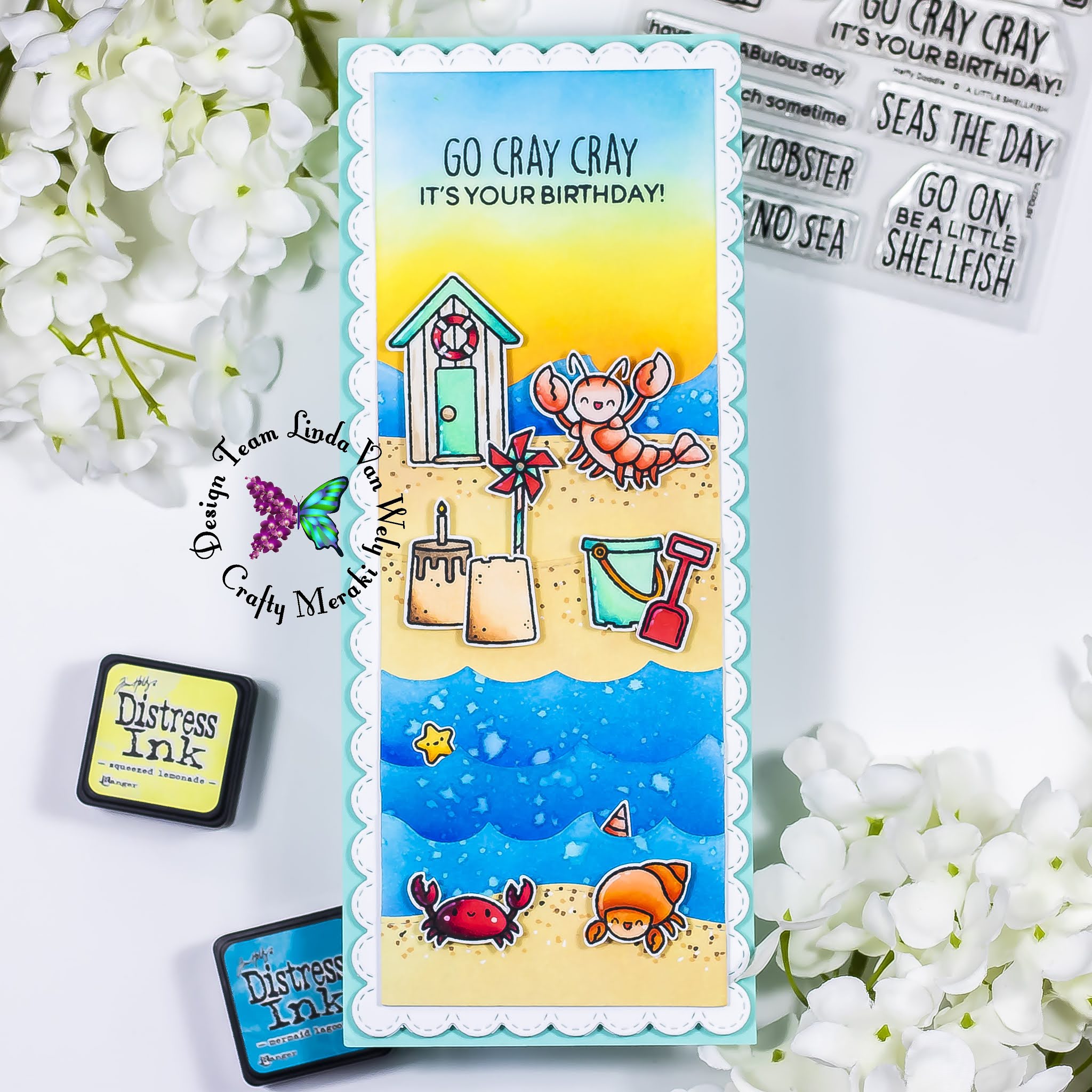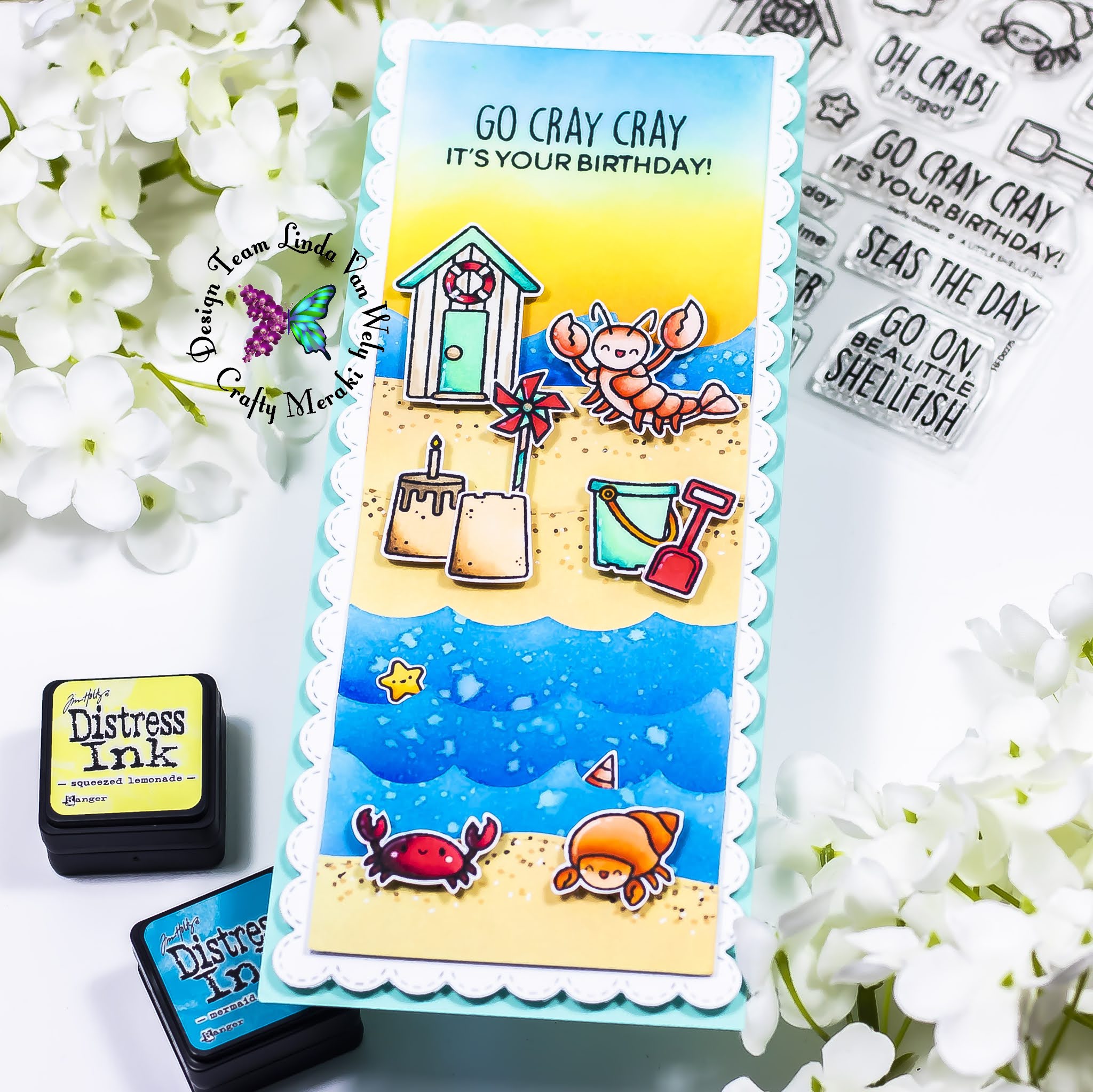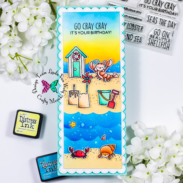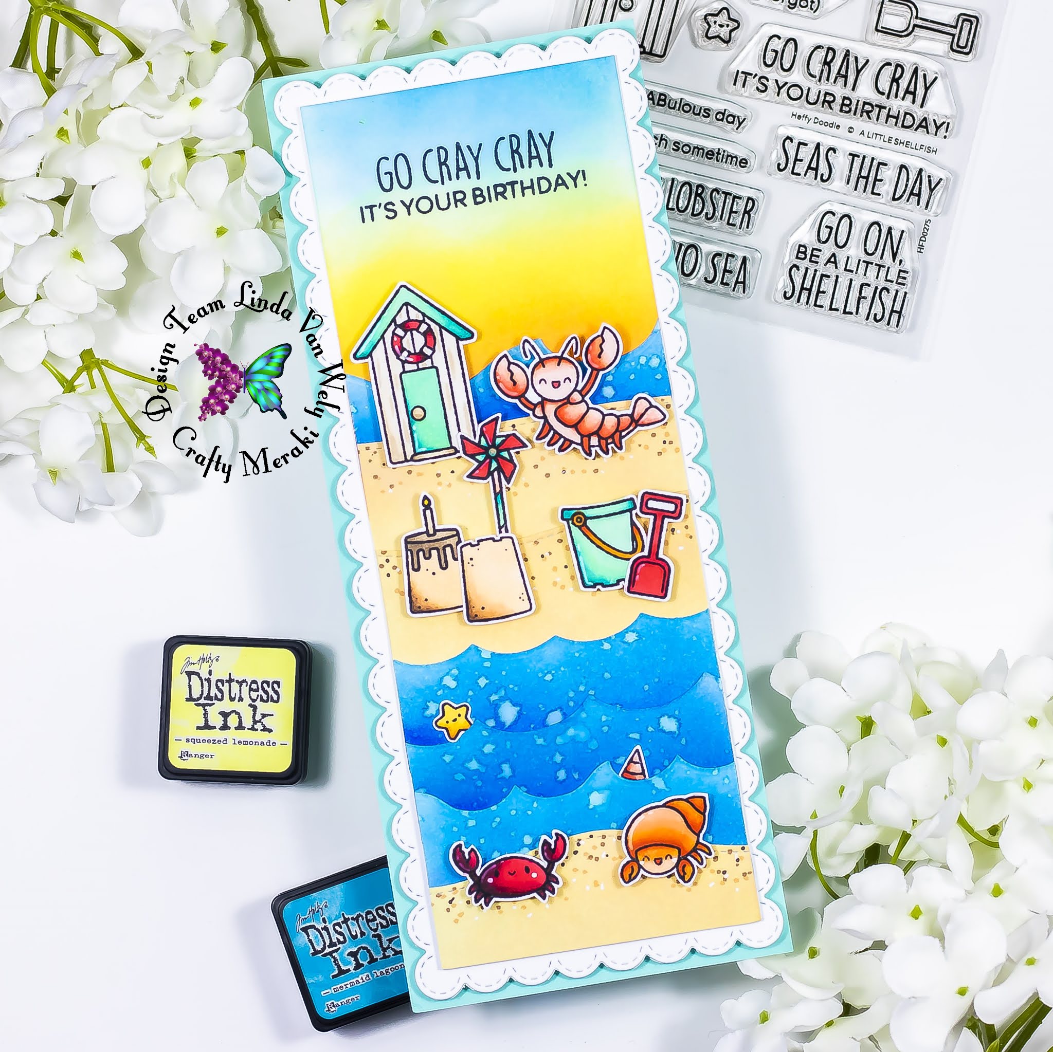 Hi everyone! Linda here today with a fun slimline card! I know for most of you it's fall going on winter times, but I wish it could be summer all year long! I created this fun card with a summer feel with the A Little Shellfish stamp set from Heffy Doodle!