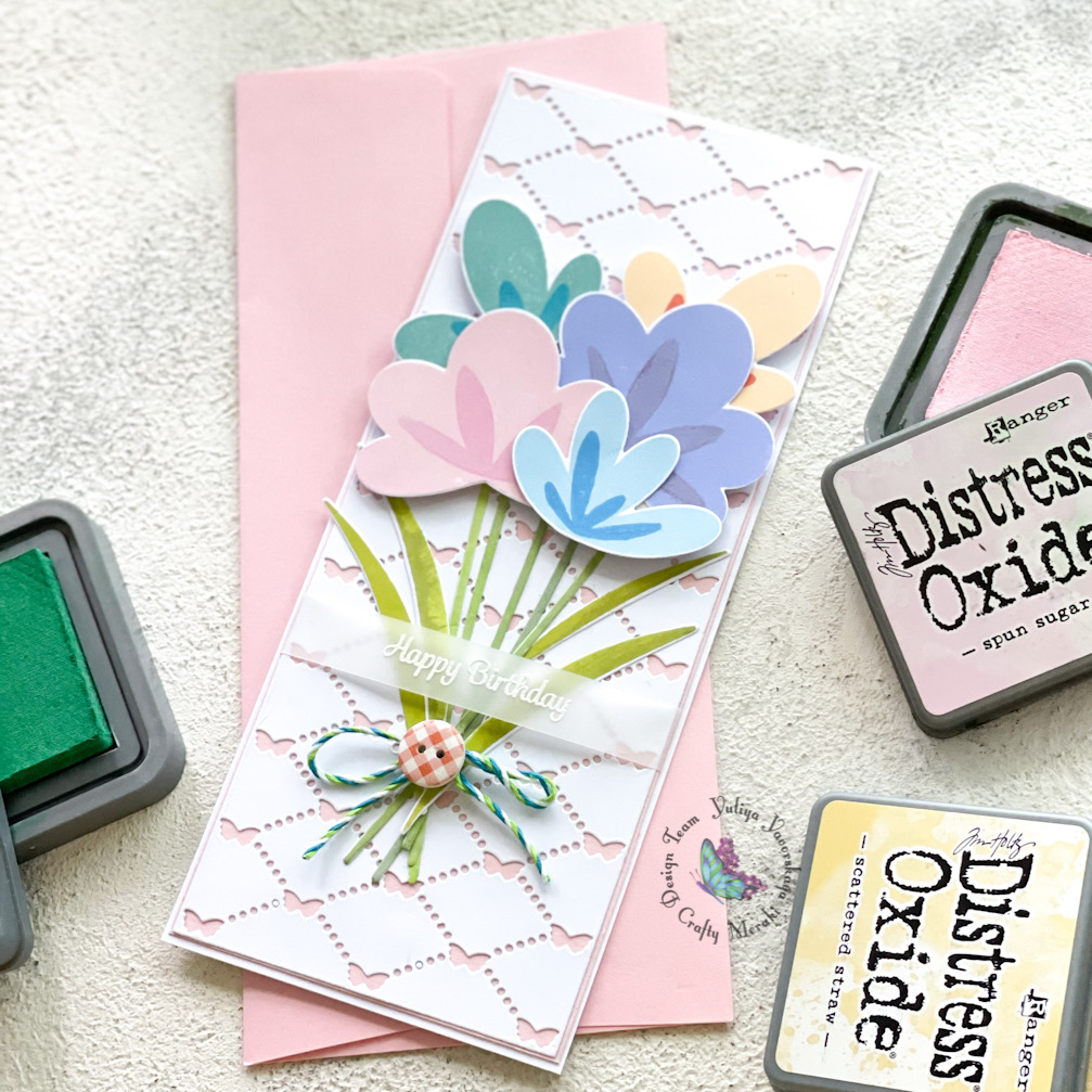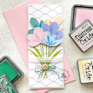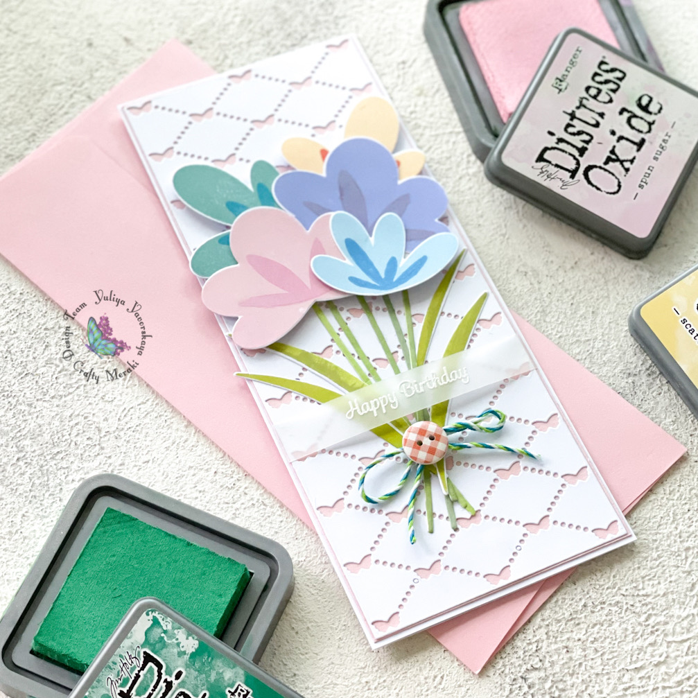 I decided to use a pretty Simple Blossom stamps set from Pinkfresh Studio which is available at Ctafty Meraki online store. I created this beautiful bouquet with this adorable layering stamp set using Distress Oxides inks. Then I die cut the images with Simple Blossom die set.