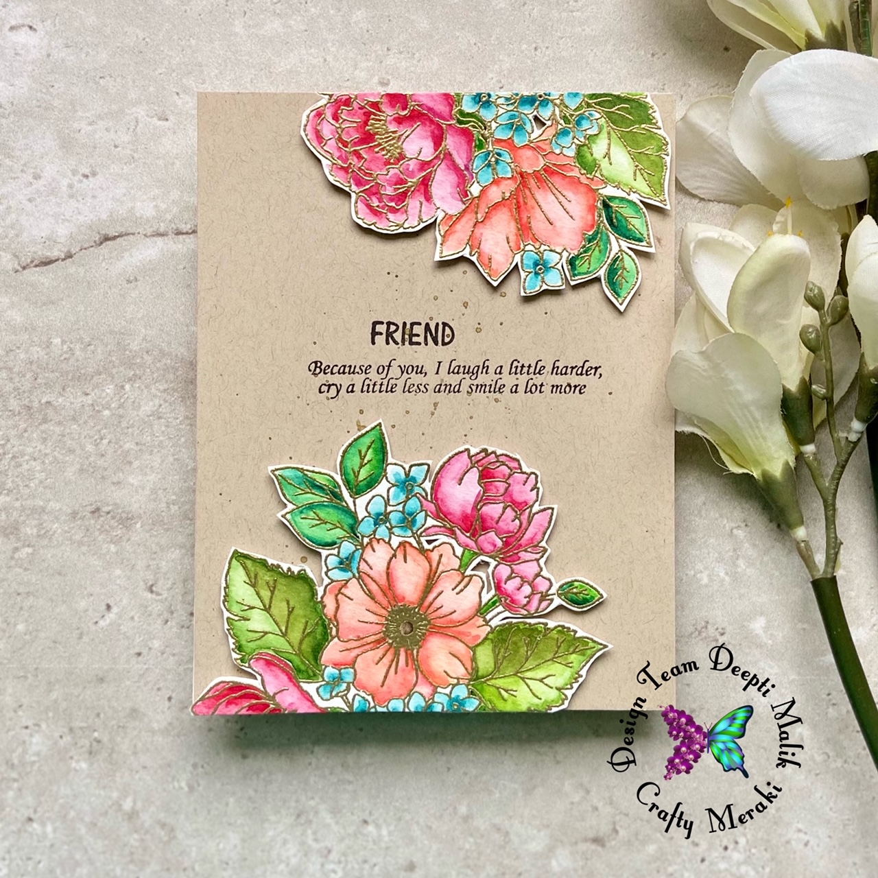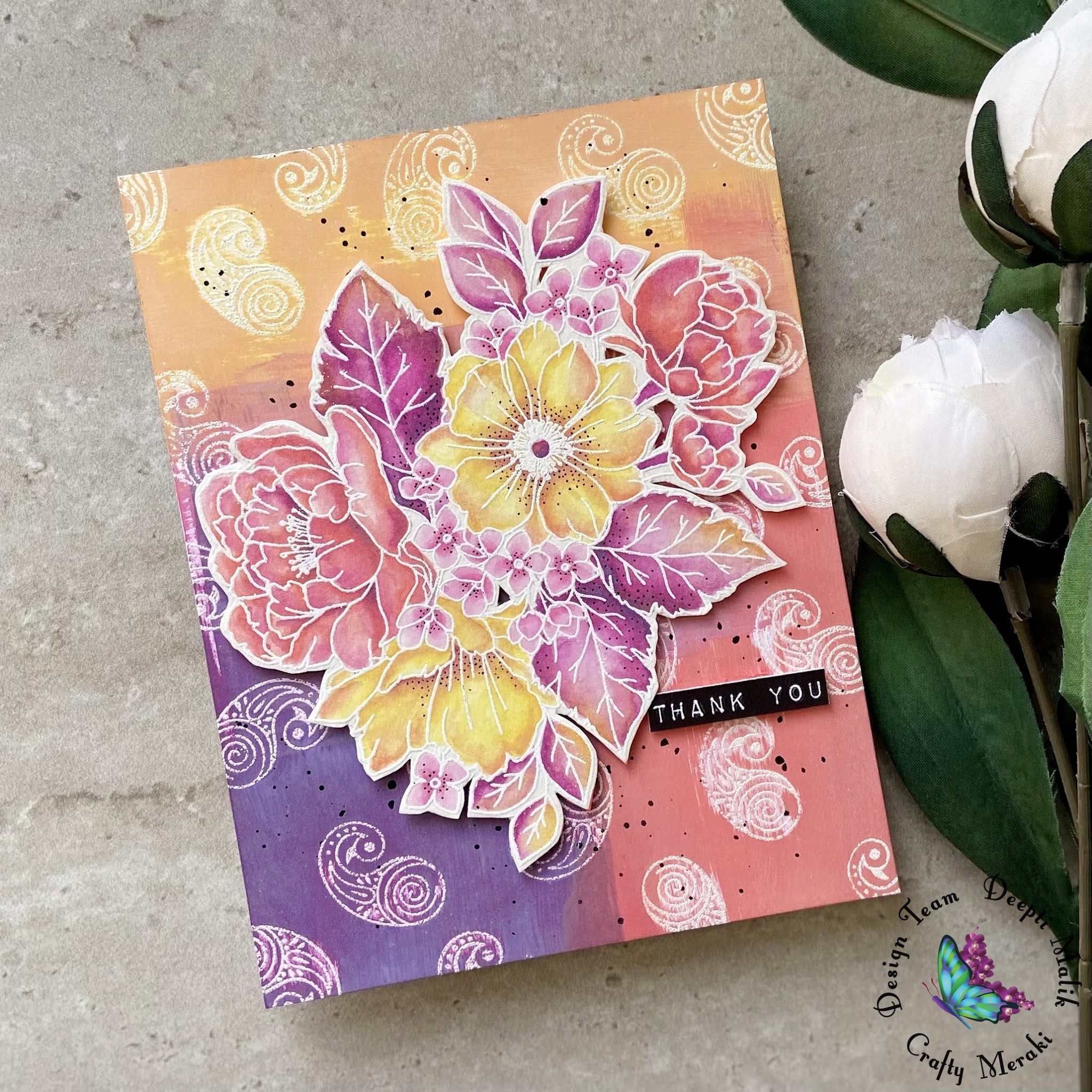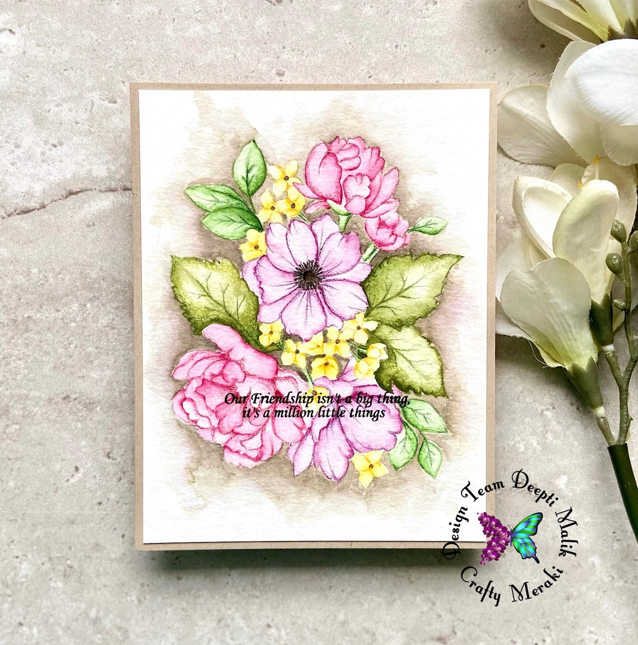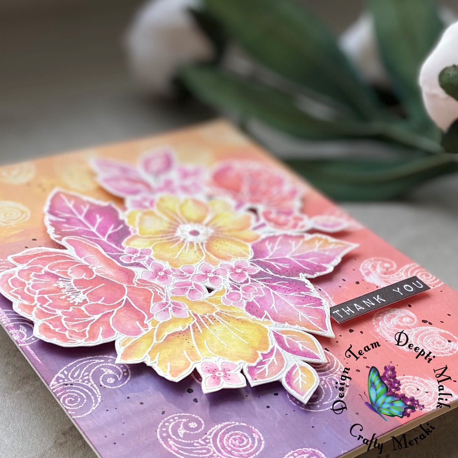 Then used distress oxide inks to make a swiped ink background. Distress oxide inks overlap better to make an even background. I then heat embossed the floral cluster on a water color card stock and used Distress Oxide inks to watercolor it. I then adhered it with some dimension. To finish I adhered the sentiment from Crafty Meraki Special Edition Watercolor Kit