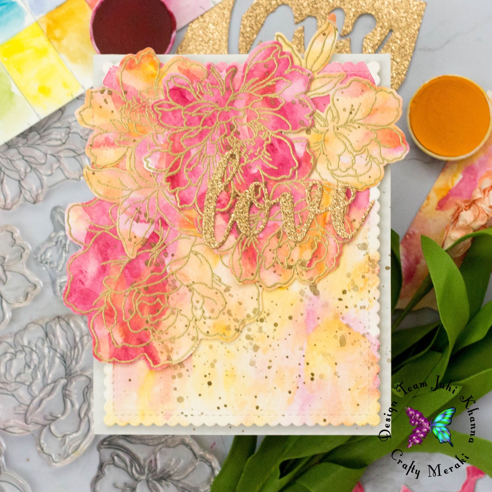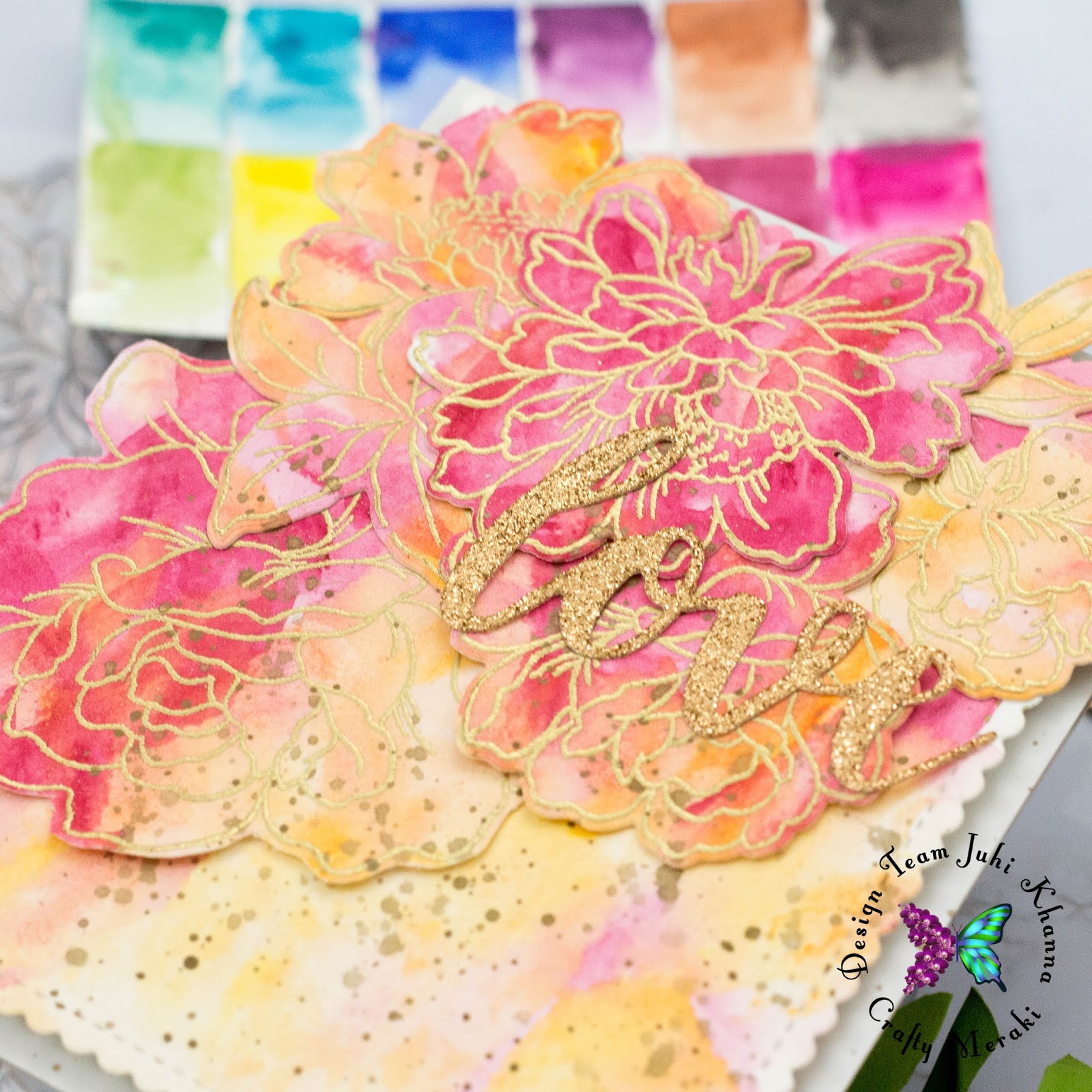 To finish the card, I created the watercolor background panel in the same way and added the die cut florals and a die-cut "Love" sentiment also from Altenew.