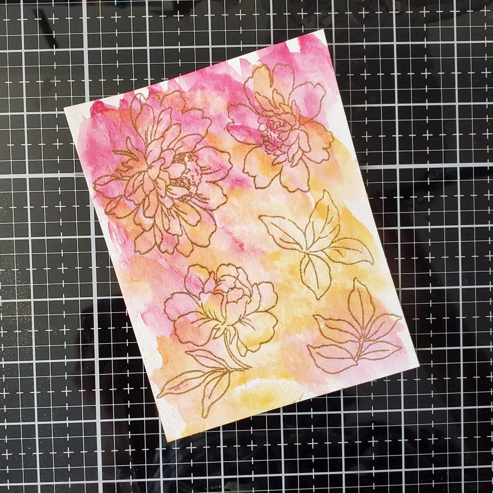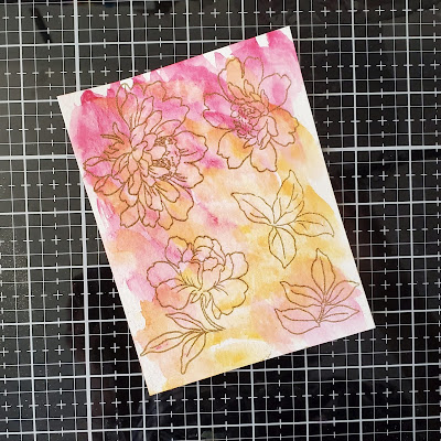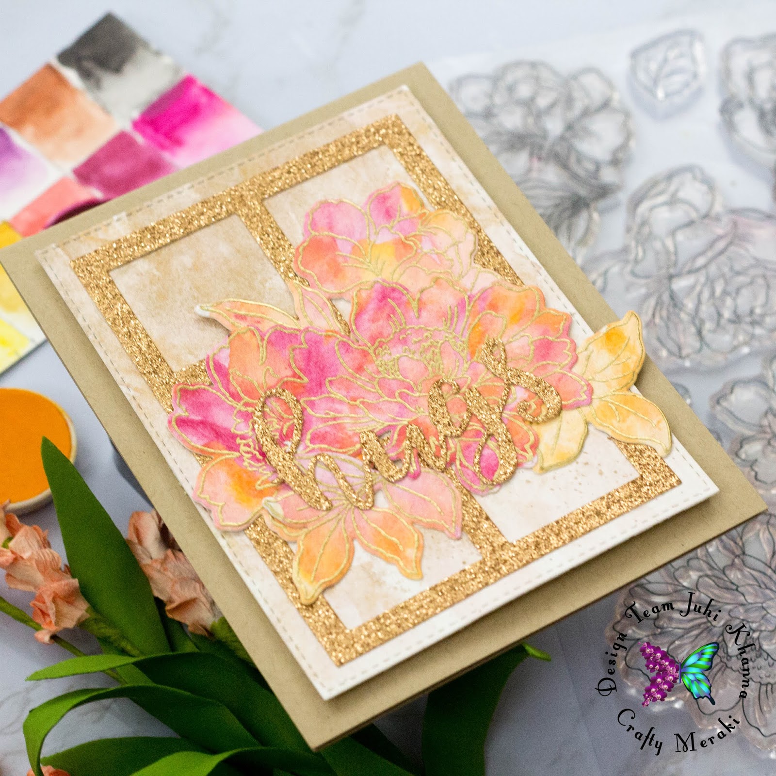 Once the piece was completely dry I stamped the images from the Altenew Flower Garden set and heat embossed them with Brutus Monroe Gilded embossing powder.To finish the card, I created the watercolor background panel in the same way and added the die cut florals and a die-cut "Love" sentiment also from Altenew.
