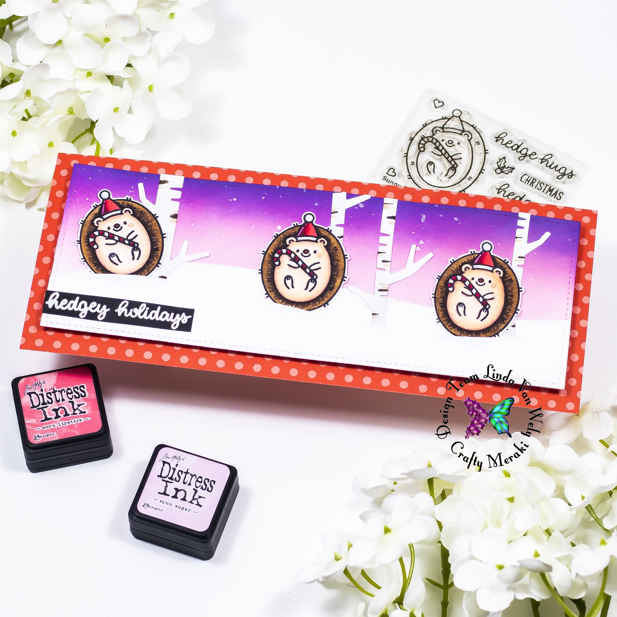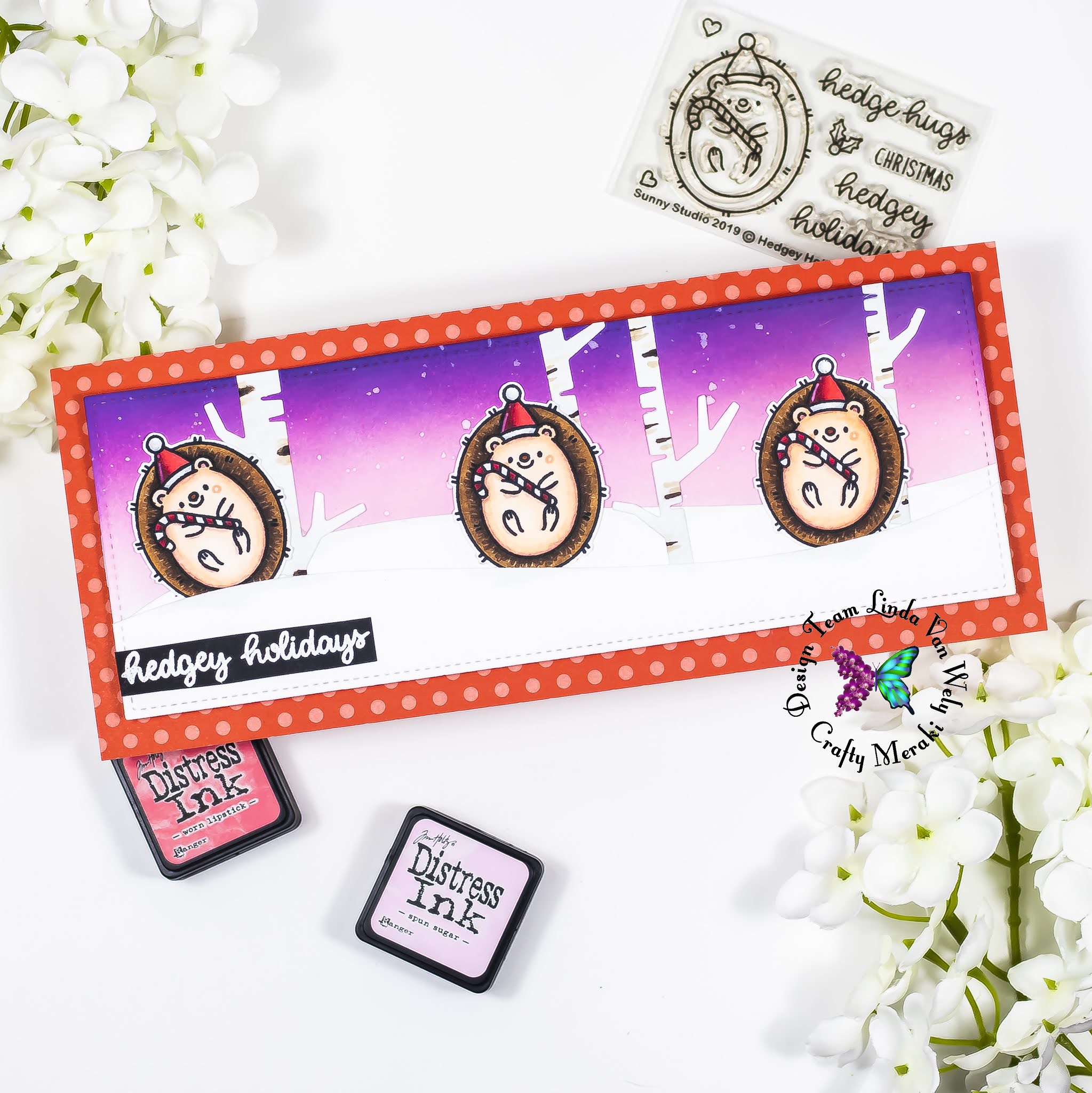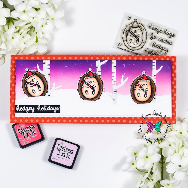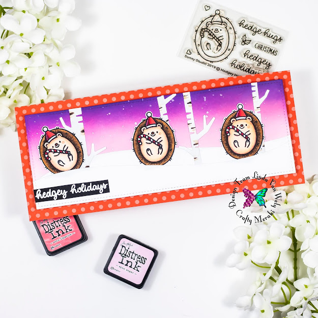 Hi there crafters! Welcome to a new Crafty Meraki Blog Post! Linda here today with a very adorable card! I created this sweet slimline card with the adorable hedgehog from the Hedgey Holidays stamp set from Sunny Studio! Make sure to check it in the store!