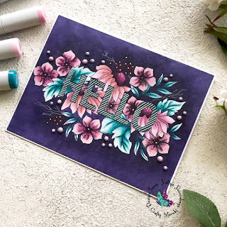 To start I trimmed a panel from Color Copy Solar white paper and stamped the main image using Jet Black Memento Ink Pad. Then I used my Copic Markers to color the flowers. I used R81, R83, R85. And BG45, BG15 and BG10 for leaves. I used BG98 to color the word HELLO.