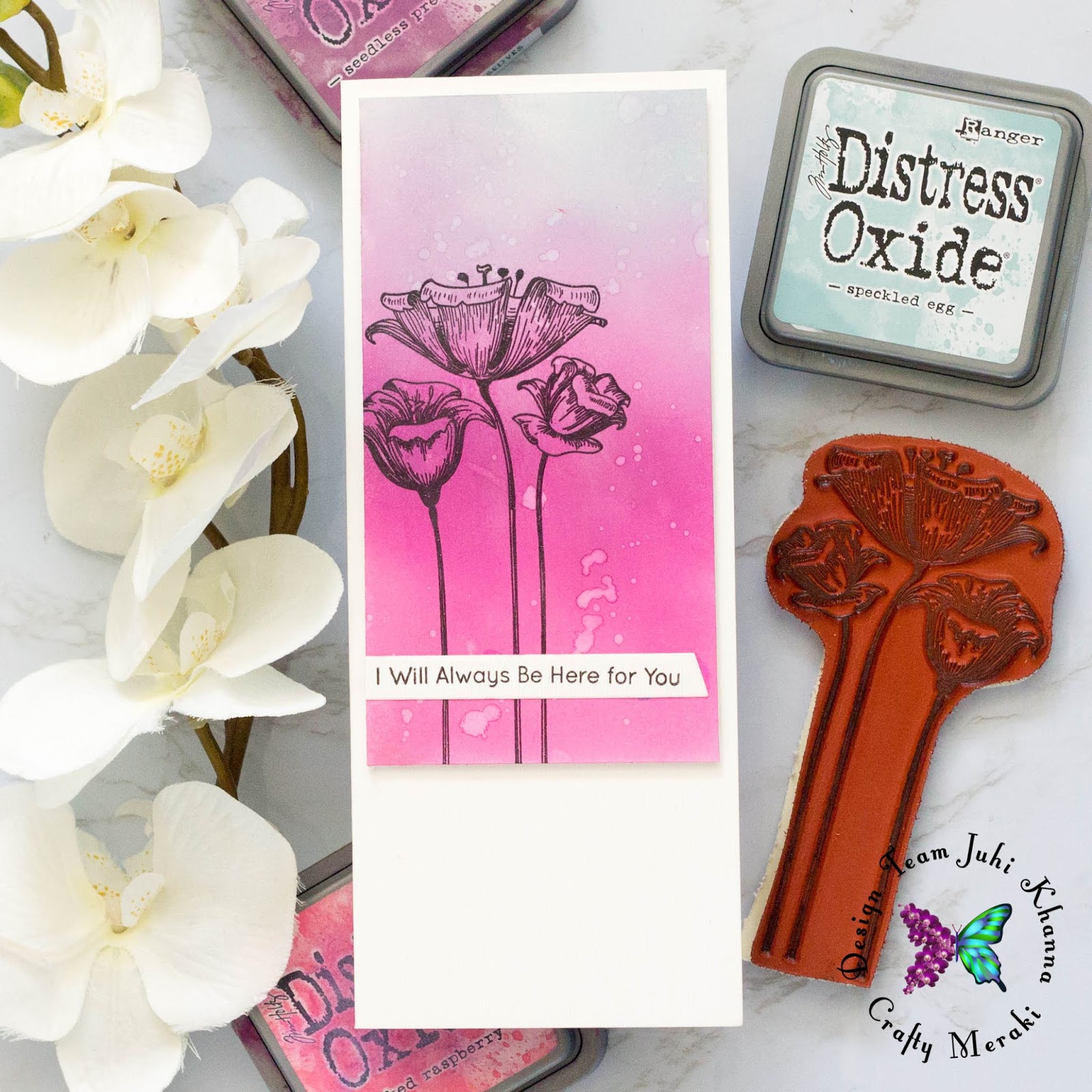 I created a distress oxide ink blended background panel using colors - Speckled Egg, Seedless Preserves, Picked Raspberry. Sprinkled some water to activate the oxides, stamped the image in black and mounted the panel on a textured while cardstock base.