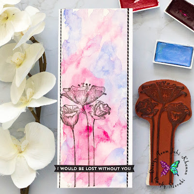 I created a messy watercolor background using the wet on wet technique and stamped the floral image in black to create my second card.