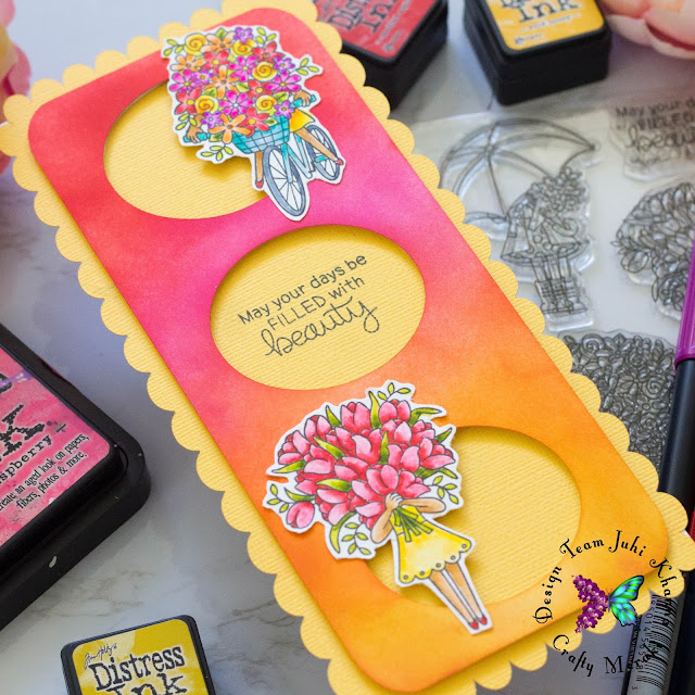 I finished the card by mounting the scalloped frame on a slimline card base and adding the ink blended top layer with double-sided foam tape and finally adding the fussy cut colored images.