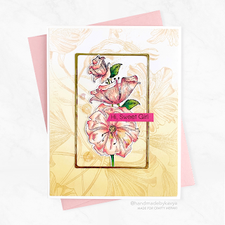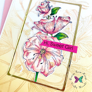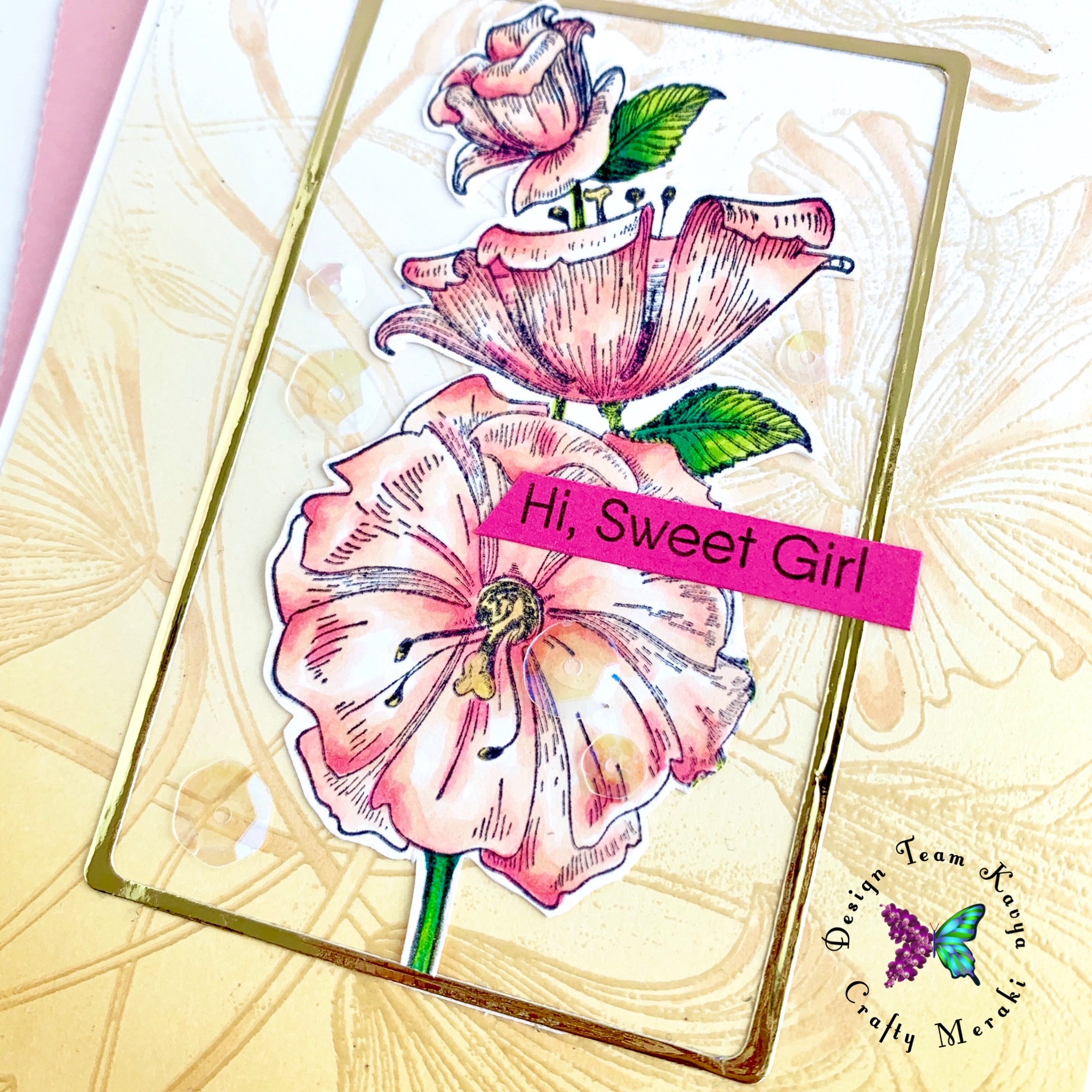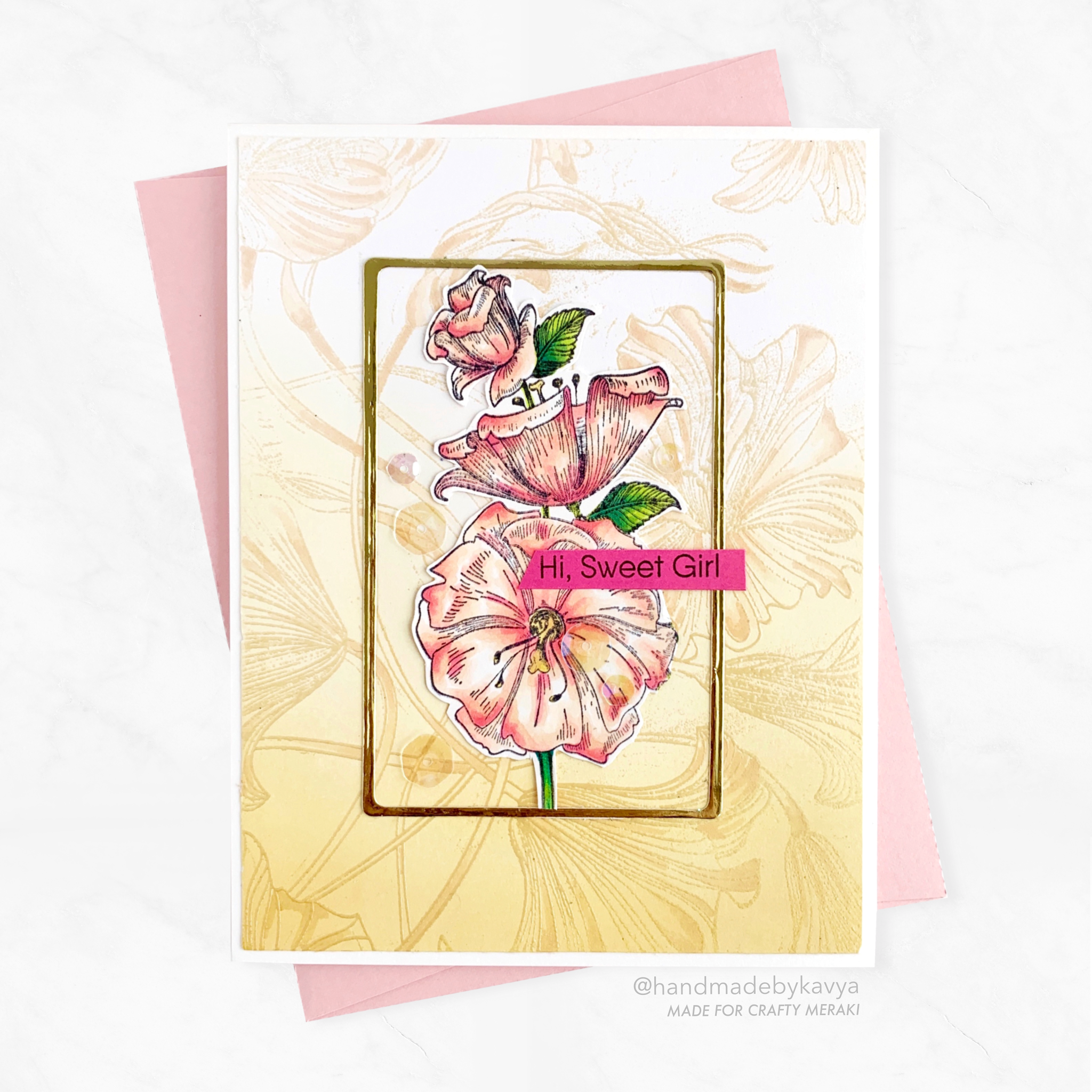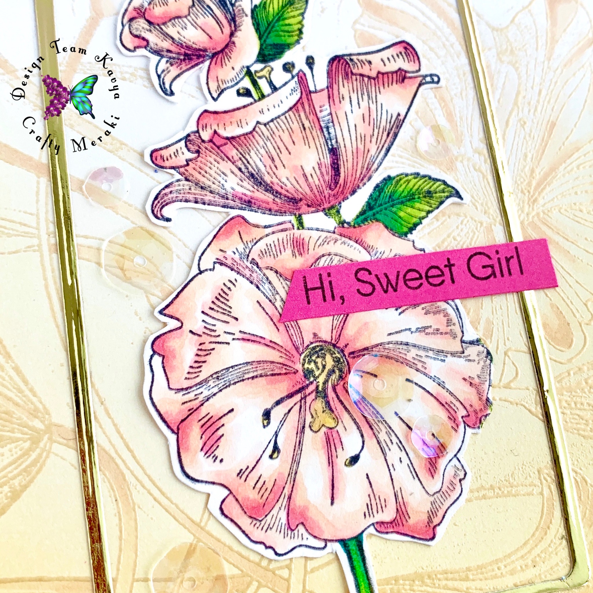 - Add a sentiment and embellishments of your choice to finish it up! I used a sentiment from MFT Flower Fairies stamp set available at Crafty Meraki and some holographic clear sequins