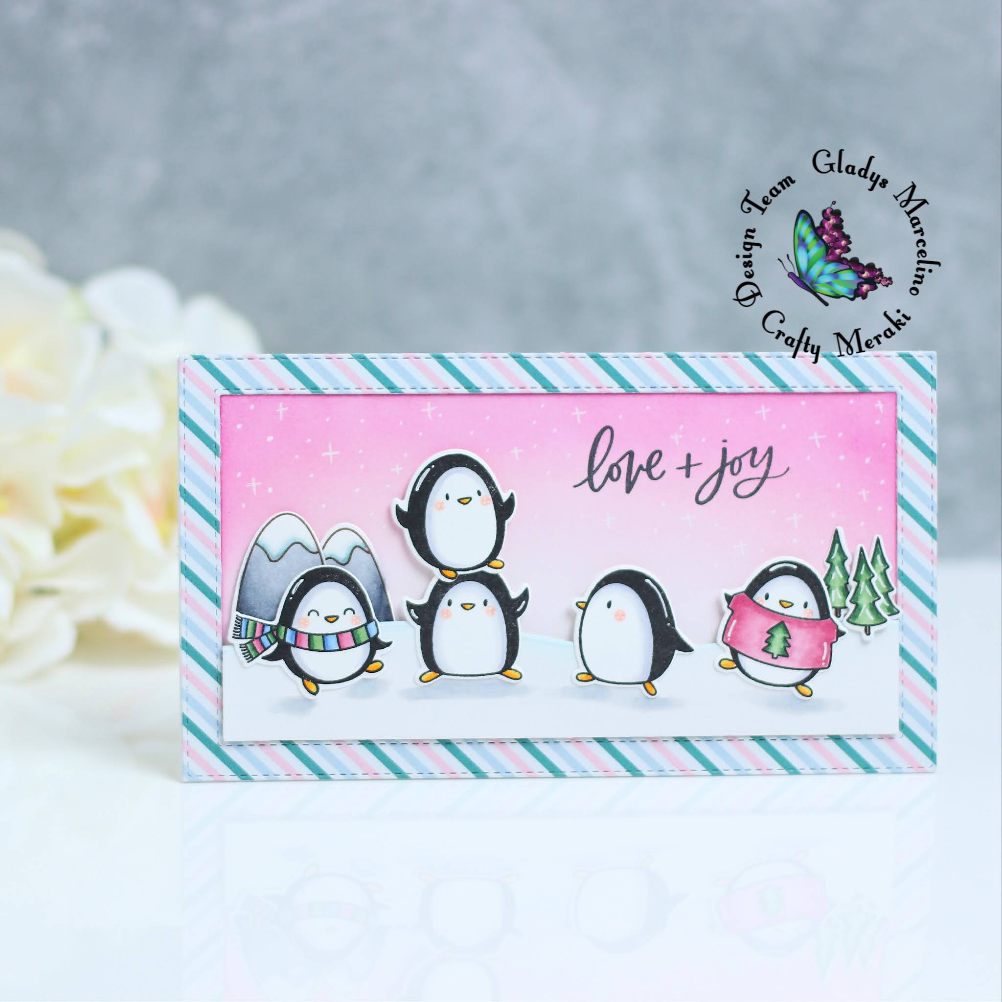 Next I used the Framed-Worthy mini slimline to cut twice from white cardstock and once with the striped pattern paper. I glued them together to give more stability. I ink blended the background using distress oxide inks in spun sugar, worn lipstick and picked raspberry. I also cut a snow hill for the cute penguins to stand on.