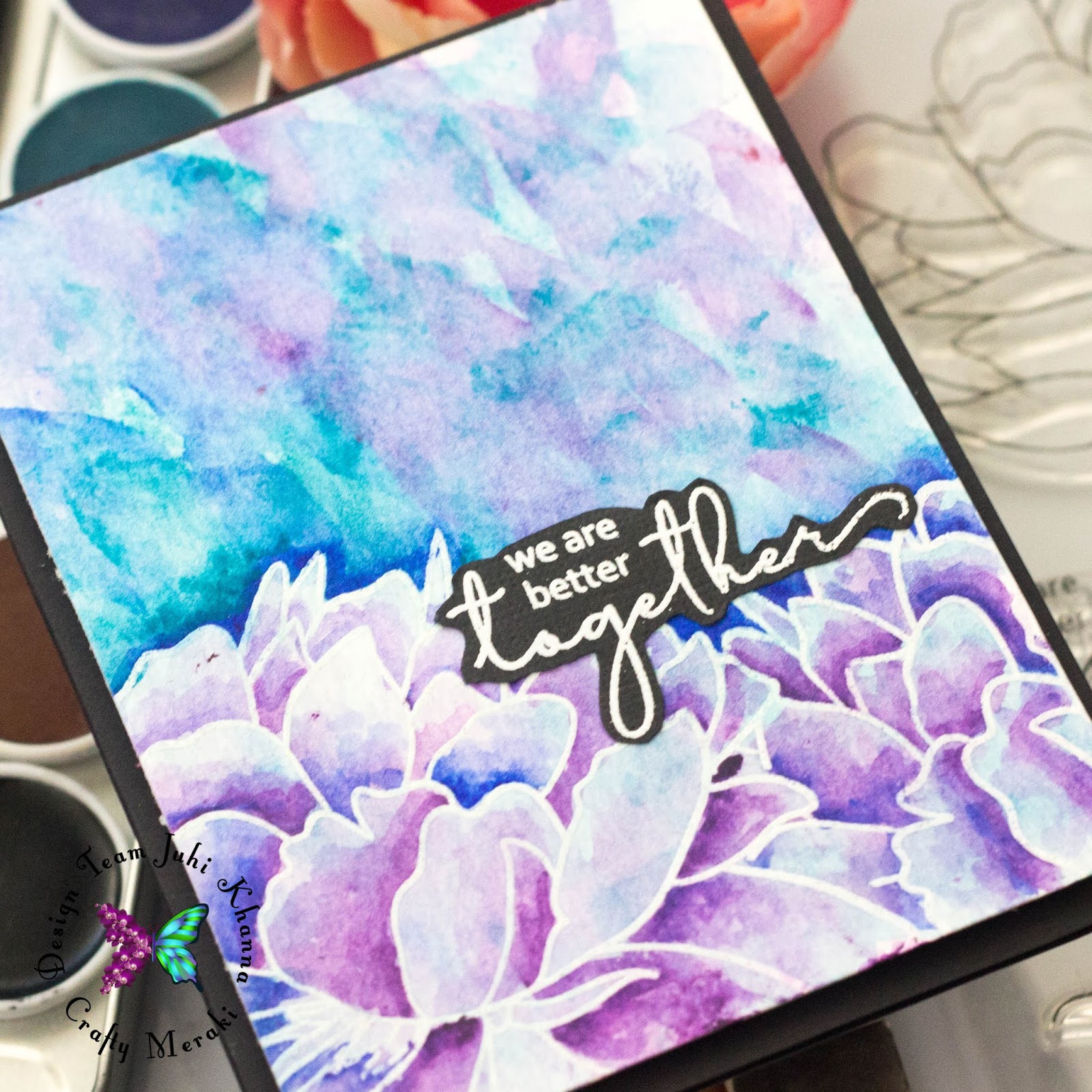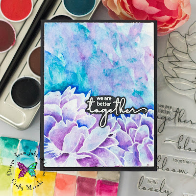 For my second card, I first stamped and heat embossed the blooms with white embossing powder. I then loosely colored the blooms and the rest of the watercolor panel in shades of blue and purple from the Altenew 12 pan set.