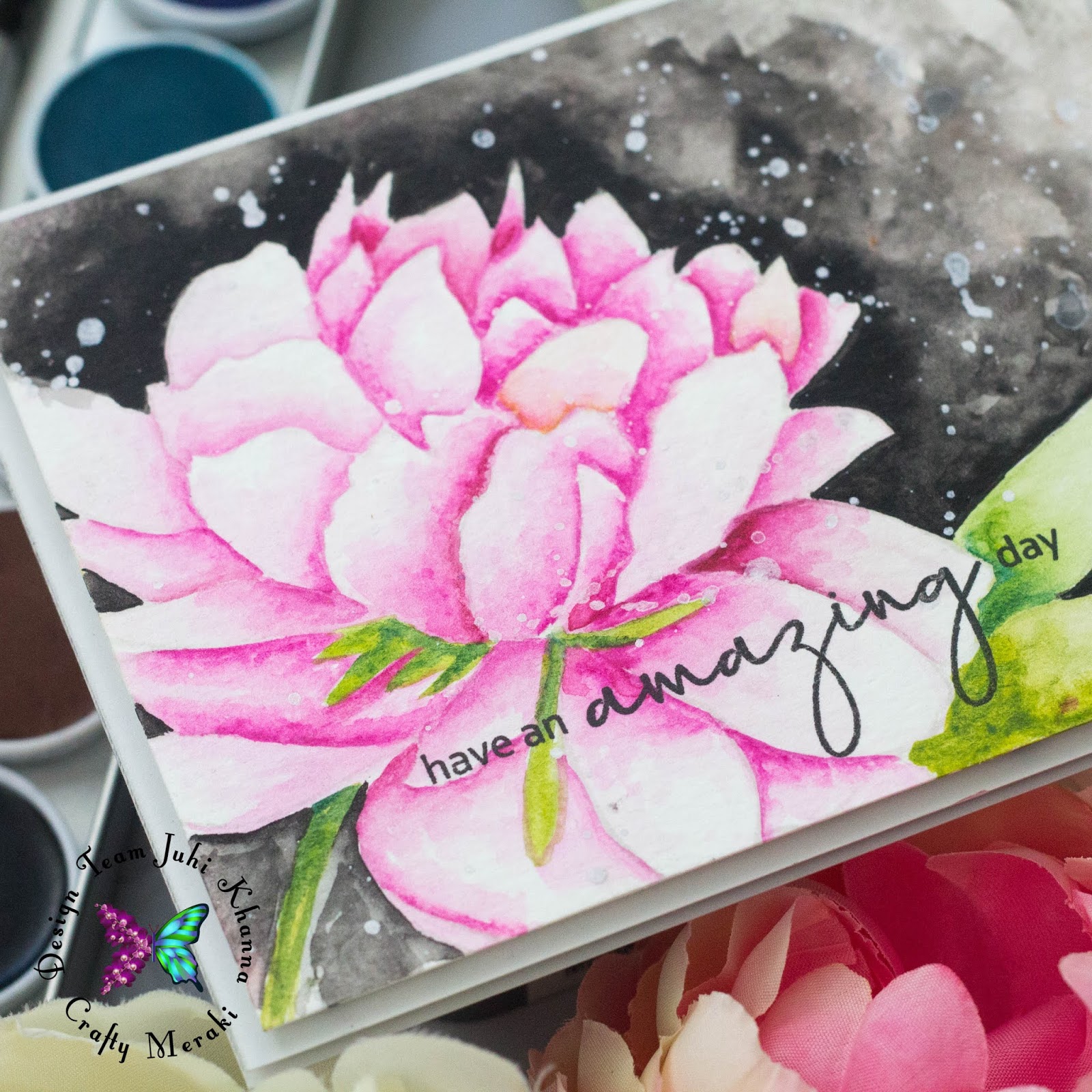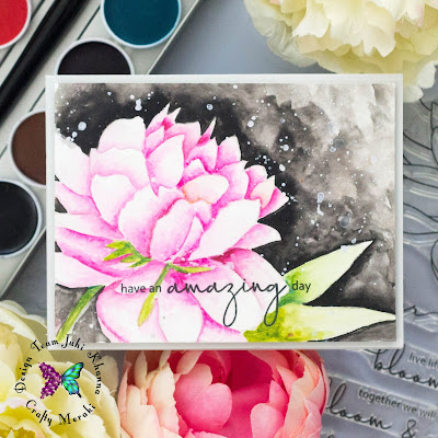 Once I was done with coloring the flower, I added a black watercolor wash around the flower. This step was definitely out of my comfort zone as I really liked the colored bloom and was not sure if it would look good with the dark background. Thankfully I am happy at how it turned out.