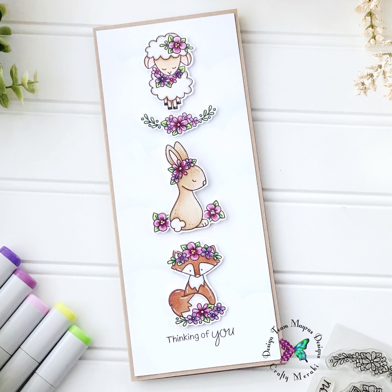 For the first card, I cut a panel of the same size as a slimline card. I then used my Copic markers to color the images in. I used E55, E31, E35, and a bit of E41 for the bunny and sheep. For the fox, I used E31, E33, and a bit of E35. For the flowers, I used RV63, RV66, and RV69 along with V01, V06, V17, and V15.