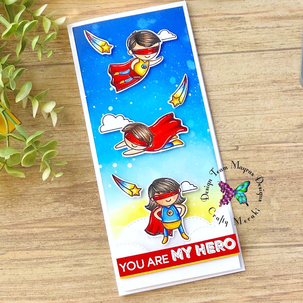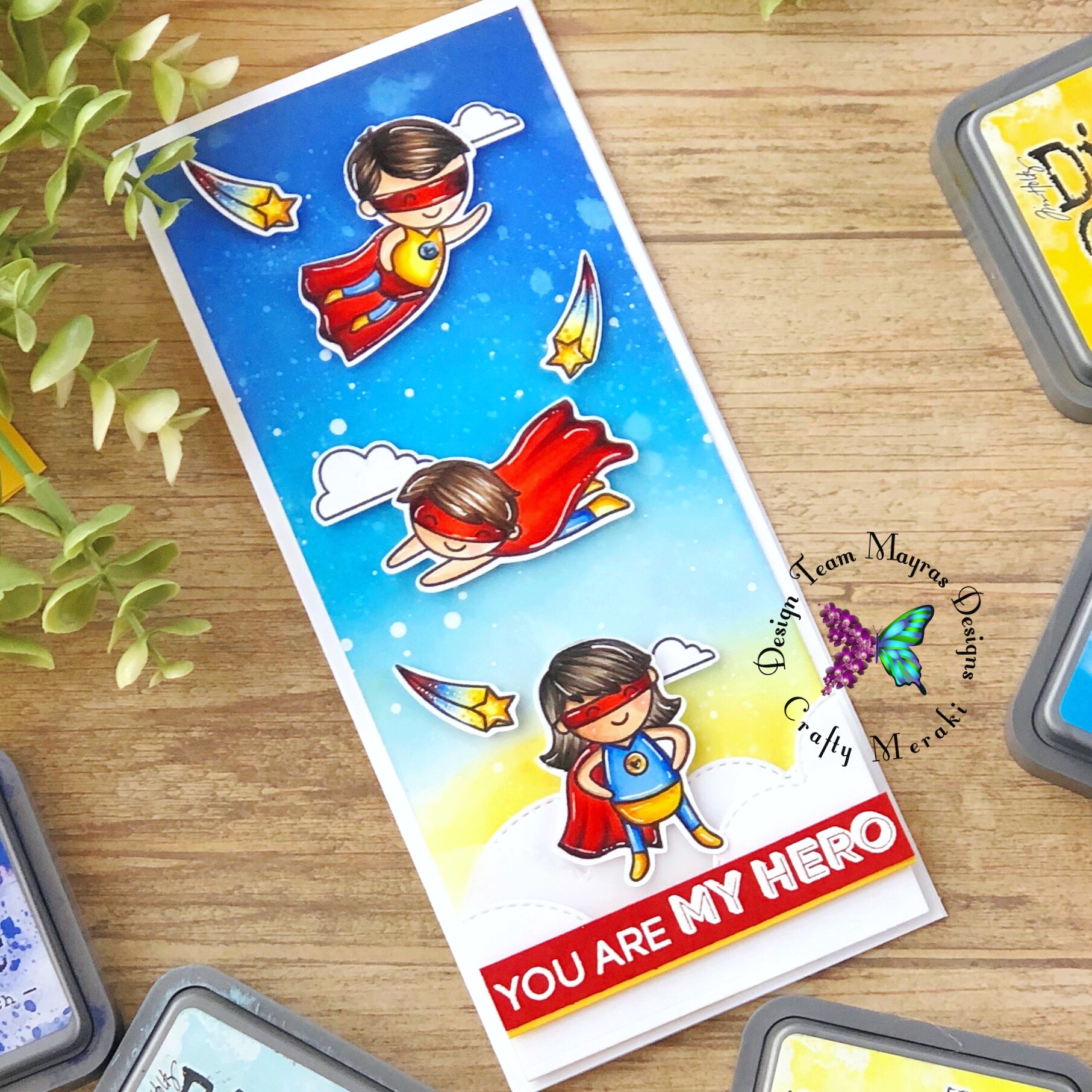 Who is your hero? Are you like me, I have several heroes in my life. My mom and dad are some of my heroes. My mom takes care of my dad who was diagnosed with early-onset Alzheimers. Her and my siblings are amazing!!! With that thought in mind, I created this superhero-themed slimline card. I used the cute Super Dudes stamp set by Heffy Doodle.