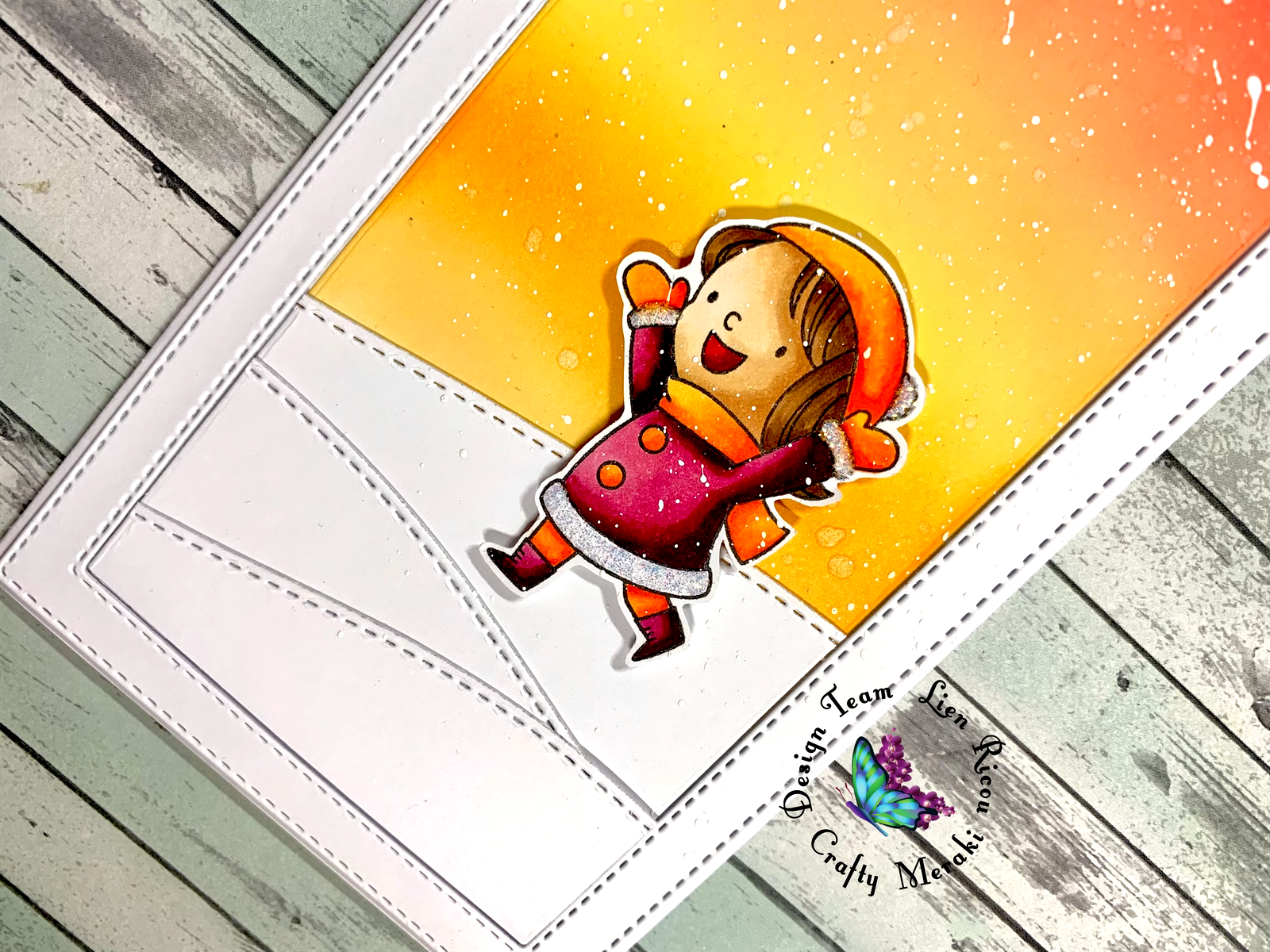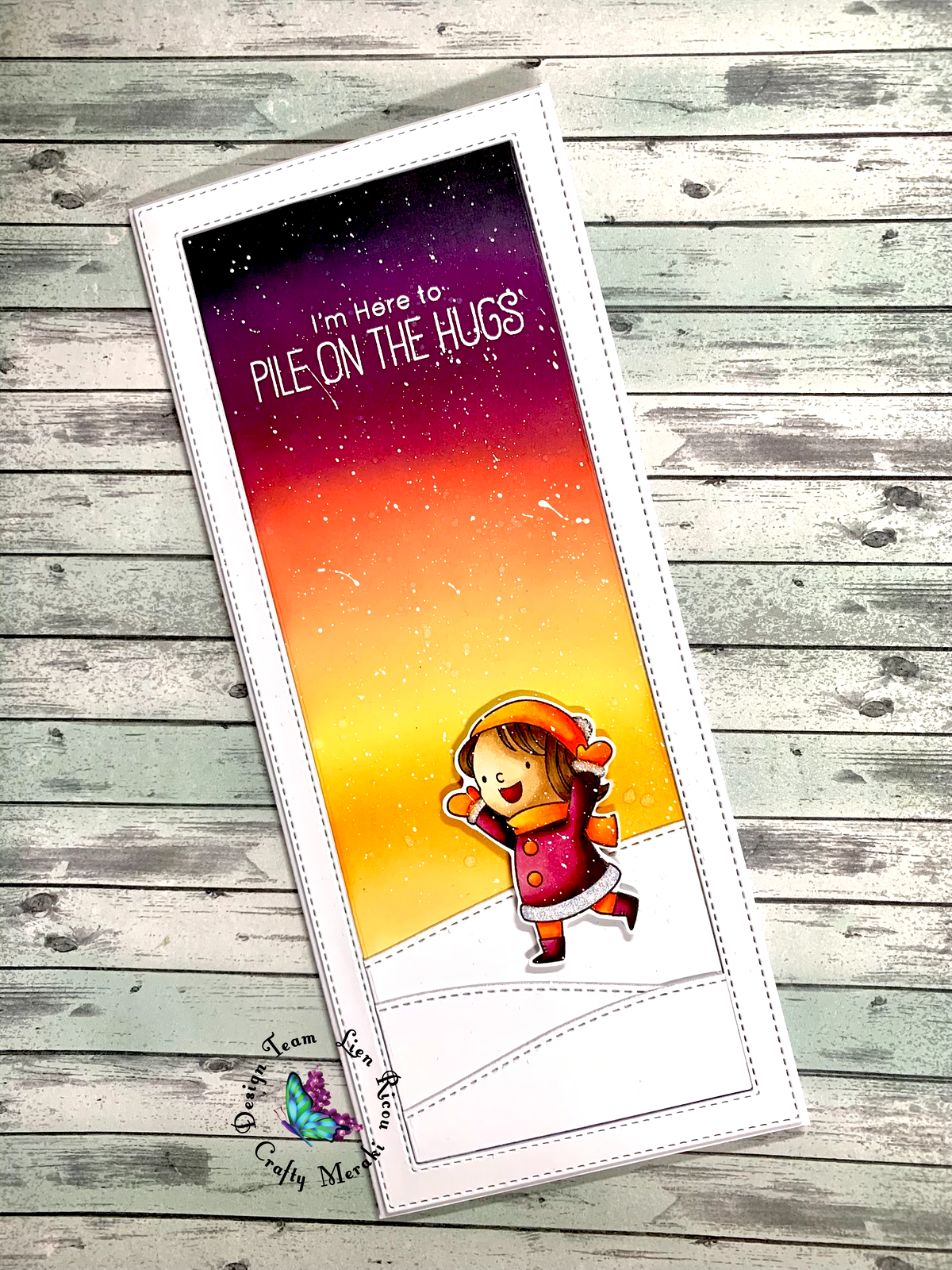Once the inkblending was done, I added some Liquid Pixie Dust on top of this panel. For the bottom of the pannel, I took the second inside piece and cut out some snowy hills using the Slimline Snow Drifts by MFT.