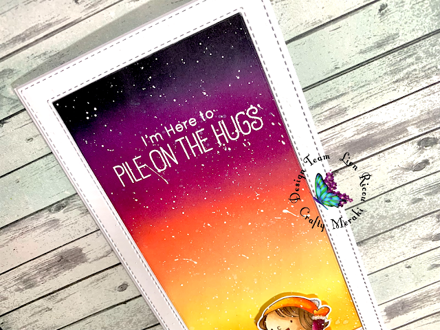 I started by stamping out my little girl (from MFT - Pile on the Hugs) onto Perfect Colouring Paper using Gina K. Designs Amalgam Ink. Next, I took my Copic Markers to color her in. When she was colored, I took some scissors to fussy cut her out.