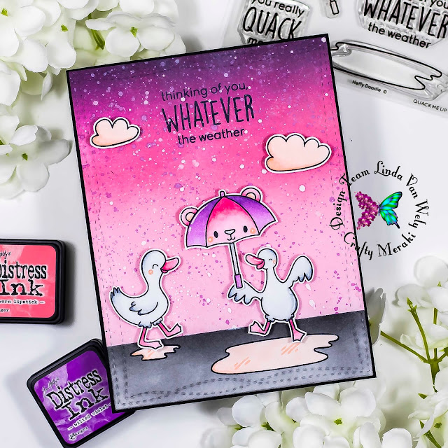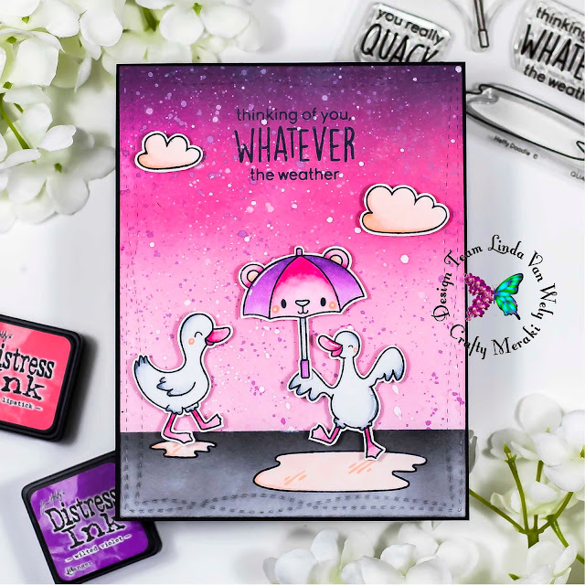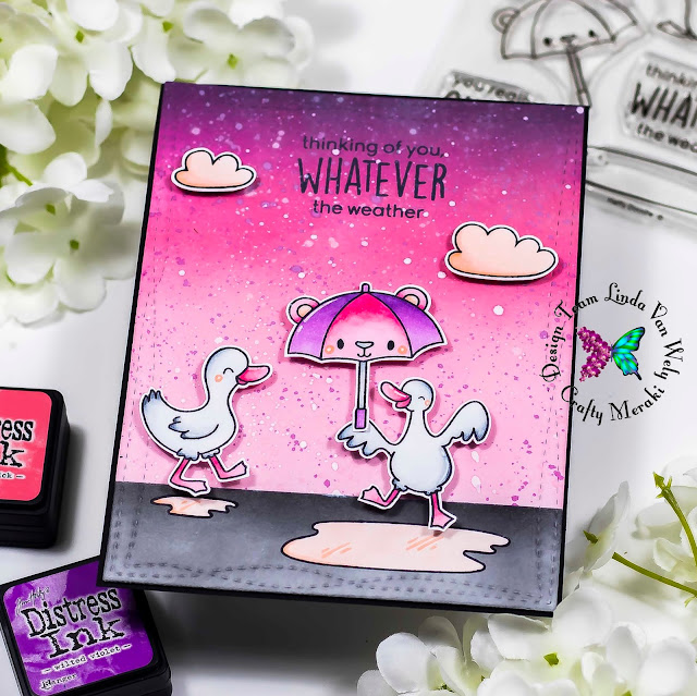 Hi there everyone! Linda here today sharing a fun pink card! This colourful card was created with the Quack Me Up stamp set from Heffy Doodle! Playing outside in the rain was never more fun!