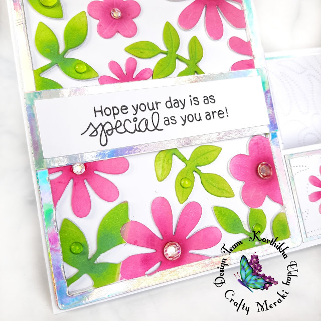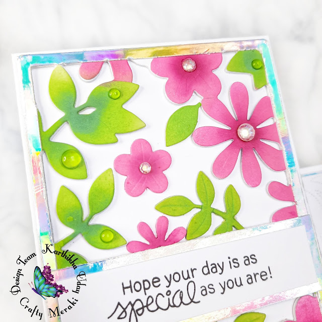 I started by creating the base side step card from white cardstock. I then die-cut the floral die thrice from white cardstock. I blended pink and green distress oxide inks on the top-most layer for the flowers and leaves respectively. I stacked all the die-cuts for a good dimension and adhered them together. I then wanted to highlight the frame, so I die-cut again from holographic cardstock, but trimmed out the inner flowers and leaves, leaving just a frame.