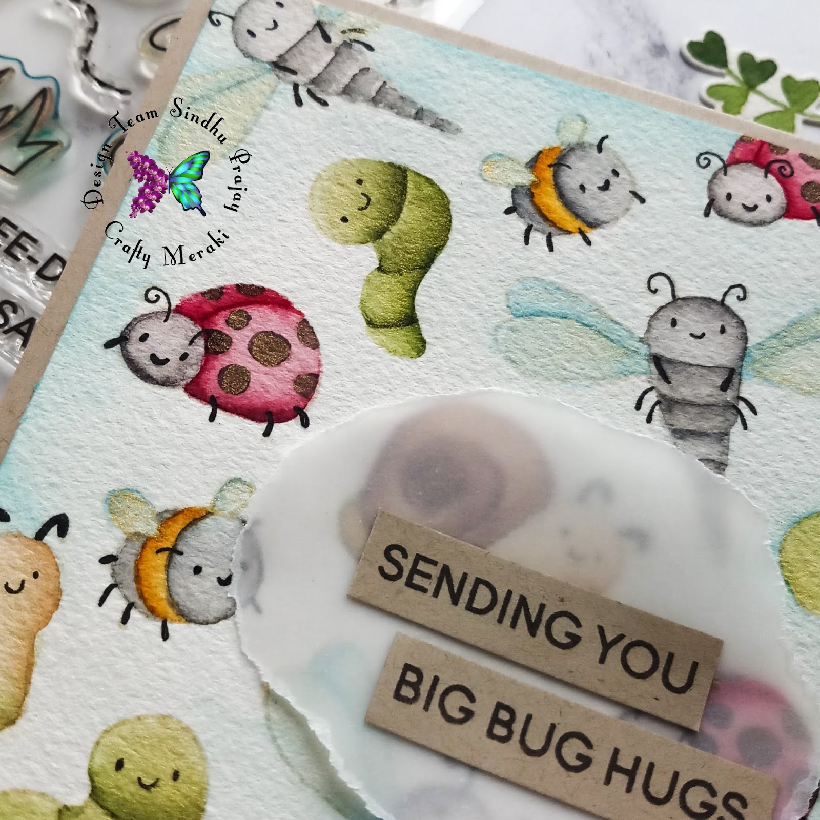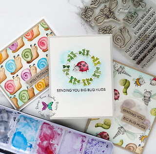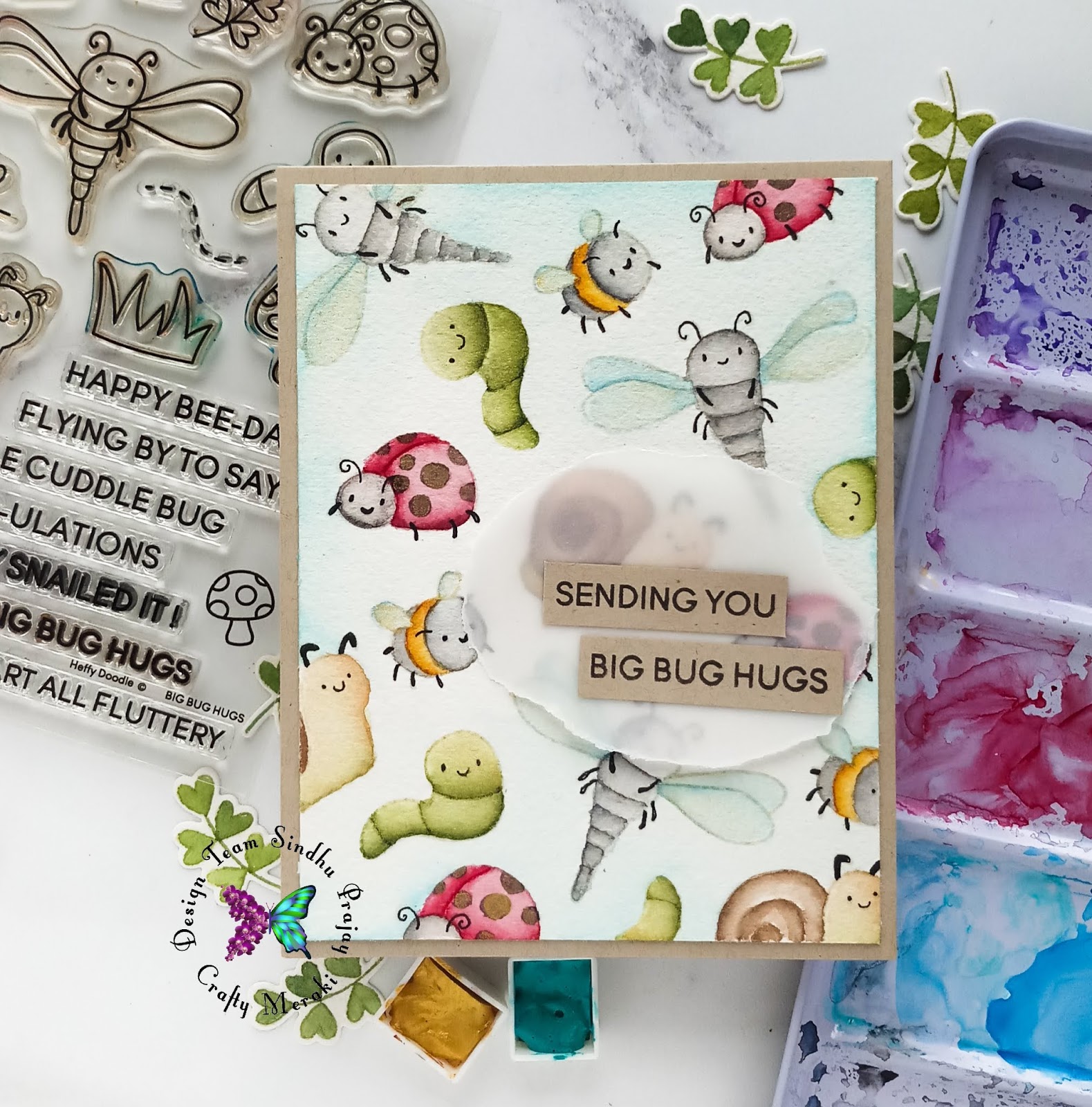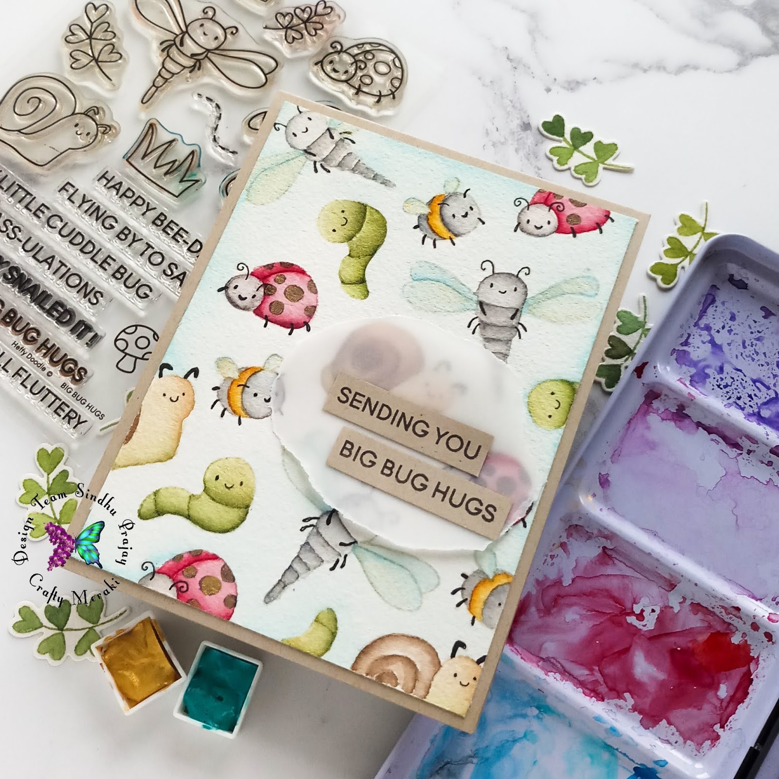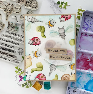 I trimmed watercolor cardstock to 4"x5.25" and randomly stamped the bugs with a light coloured ink.