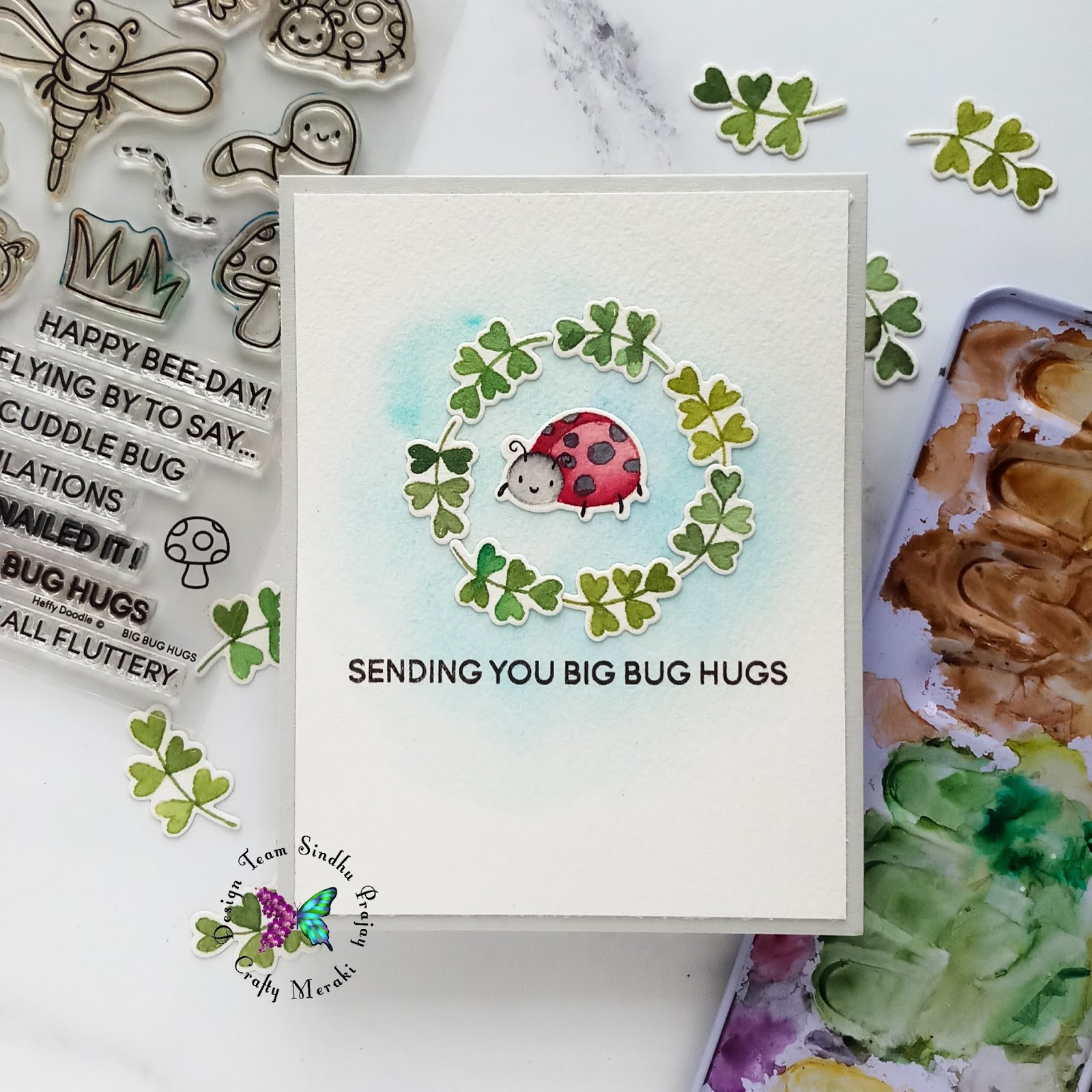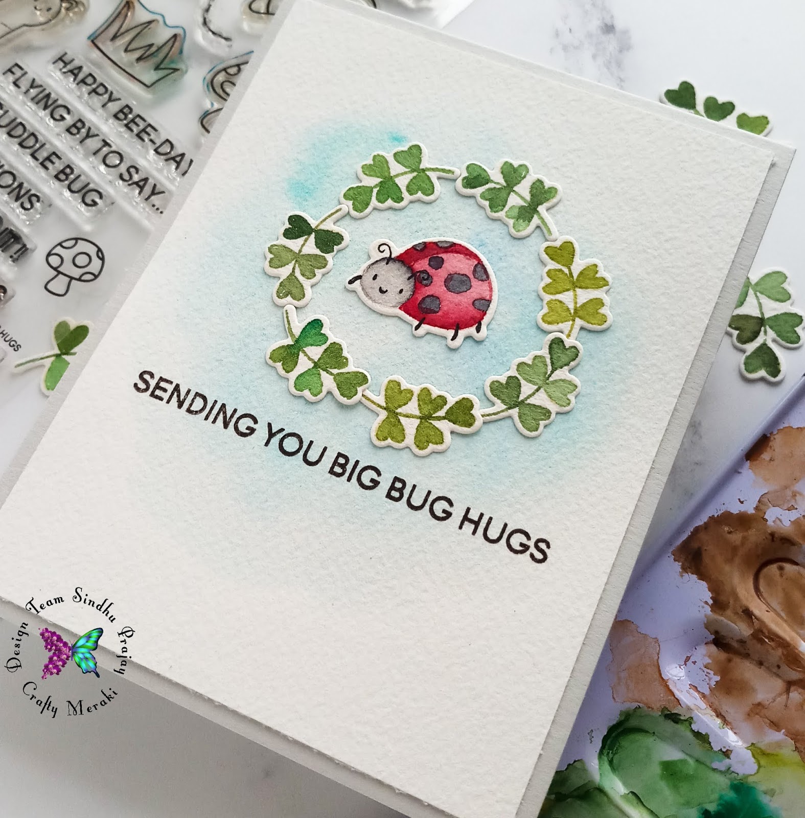 I watercoloured the leaf images several times and cut them out using coordinating dies. I also coloured a lady bug and cut it out.On a piece of watercolour cardstock, I painted a light wash of blue and added all the coloured elements. I stamped the sentiment and adhered the panel on the card base.
