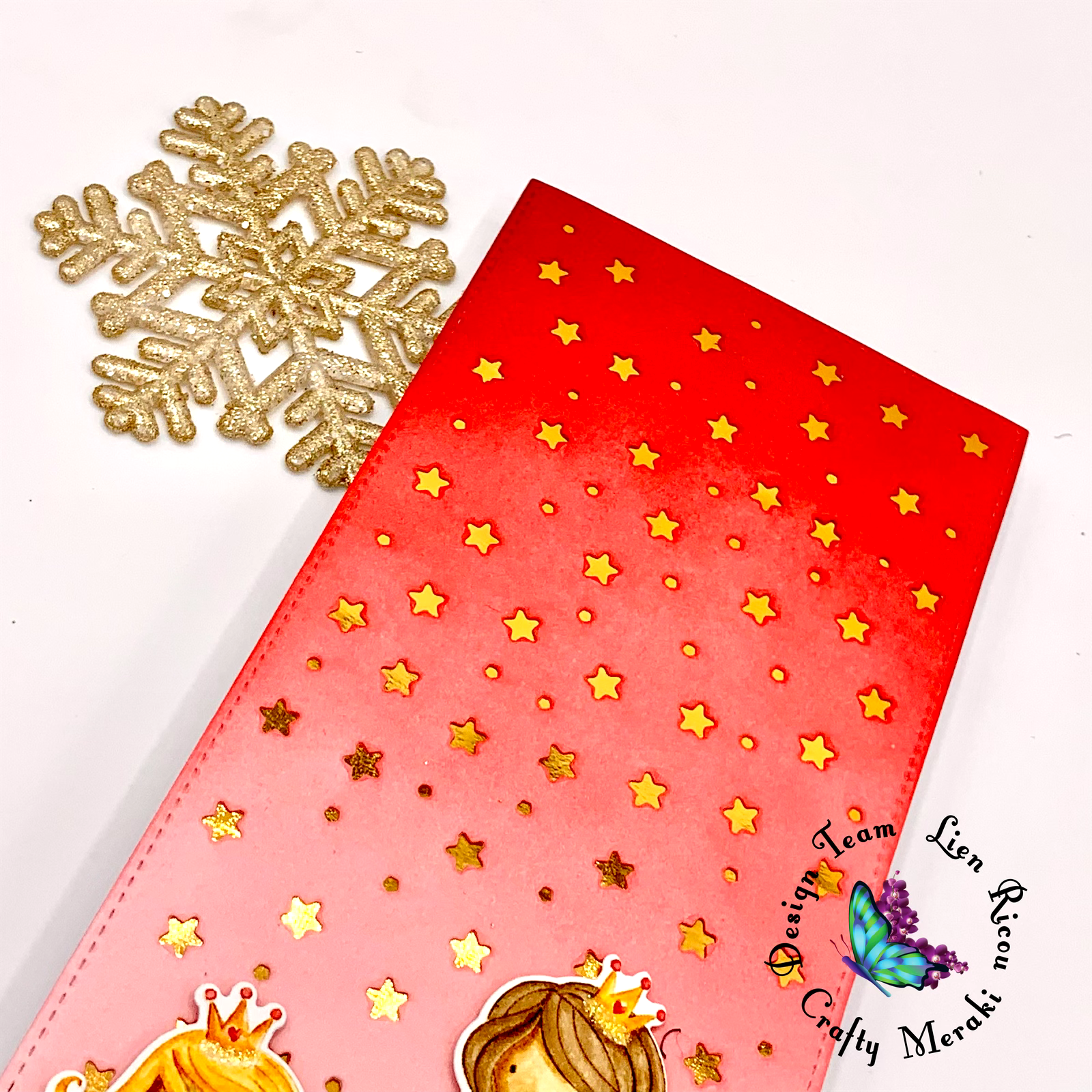 With the Slimline Snow Drifts by MFT, I cut out two snowy hills. On the bottom hill, I stamped out the sentiment with Cranberry Ink by Concord & 9th. I also trimmed down a panel of Empire Gold metal sheet. This, I added behind the background so that the stars are gold and shiny.